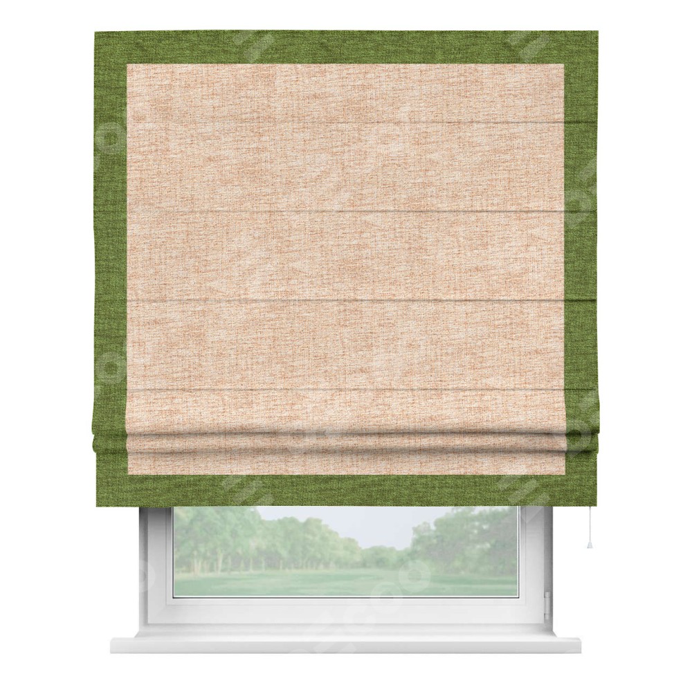 Римская штора пошита из ткани рогожка димаут персиковый, артикул: 91016, с отделкой кантом «Чесс» отличается своей уникальной деталью — наличием канта не только по бокам и снизу, но и сверху по всем краям шторы. Это придает шторе особенно аккуратный и завершенный вид, делая акцент на границах и форме шторы. Отделка кантом по всему периметру шторы усиливает её декоративные качества и подчеркивает строгую геометрию, что может быть особенно актуально для современных и минималистичных интерьеров.