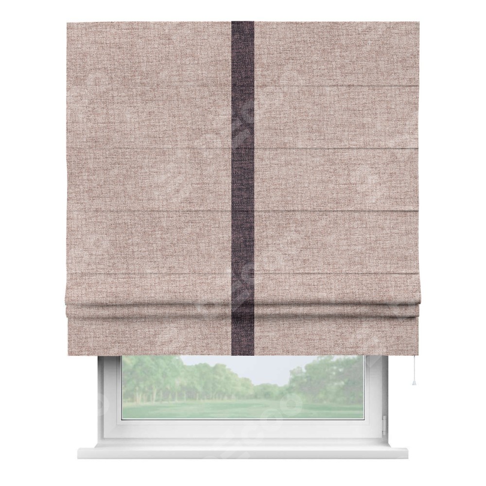Римская штора пошита из ткани рогожка димаут пыльный розовый, артикул: 91019, с отделкой кантом «Хайвэй» представляет собой уникальное и смелое дизайнерское решение, где кант расположен вертикально посередине шторы. Этот дизайн не только выделяет штору среди других вариантов оформления окон, но и создает интересный визуальный акцент, привлекая внимание к центру окна и разделяя штору на визуальные зоны. Такой нестандартный подход добавляет динамичности интерьеру и может быть использован для подчеркивания особенностей оформления помещения.