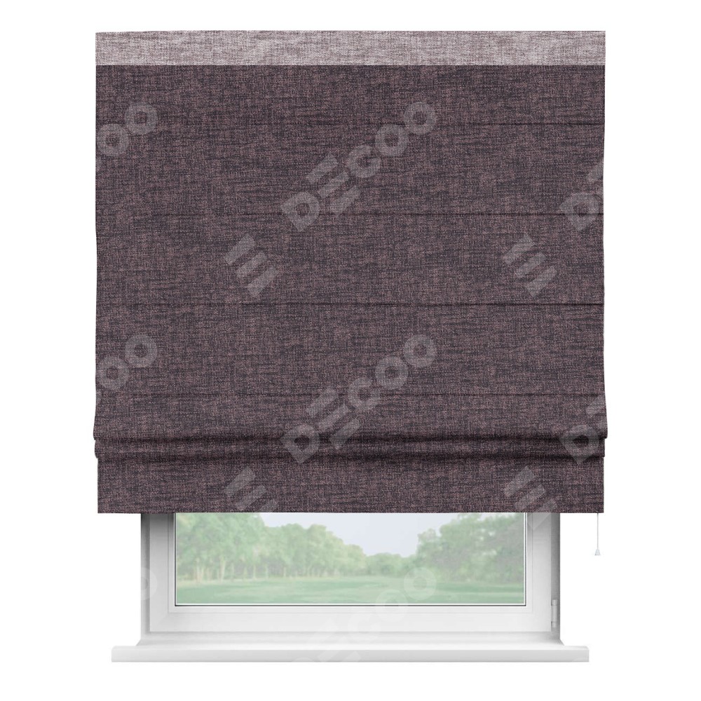 Римская штора пошита из ткани рогожка димаут розово-коричневый, артикул: 91020, с отделкой кантом «Кинг» отличается своей необычной особенностью: кант располагается исключительно сверху шторы. Такой дизайн делает акцент на верхней части окна, визуально поднимая потолок и придавая интерьеру более возвышенный и изысканный вид. Отделка кантом на верхней кромке не только украшает штору, но и может служить дополнительной защитой от износа в месте наибольшего контакта с механизмом управления шторой.