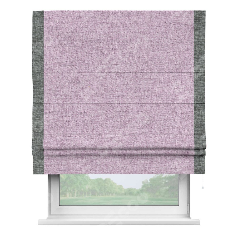 Римская штора пошита из ткани рогожка димаут розовый, артикул: 91031, с отделкой кантом «Стрим Дуо» выделяется наличием кантов по обоим бокам шторы, слева и справа. Этот дизайн придает шторе аккуратный и завершенный вид, акцентируя вертикальные линии и визуально вытягивая окно в высоту. Отделка кантом по бокам не только украшает штору, но и служит практической функцией, укрепляя края и продлевая срок службы изделия.