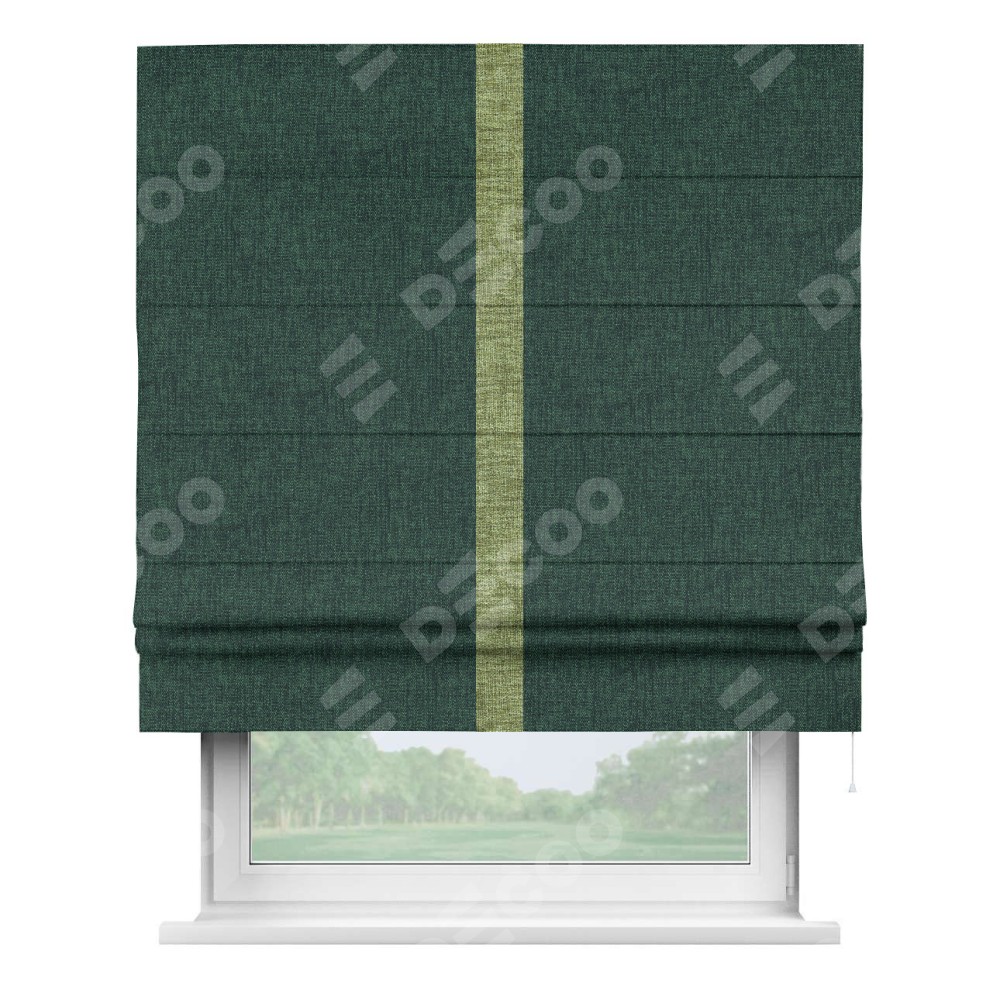 Римская штора пошита из ткани рогожка димаут тёмно-зелёный, артикул: 91022, с отделкой кантом «Хайвэй» представляет собой уникальное и смелое дизайнерское решение, где кант расположен вертикально посередине шторы. Этот дизайн не только выделяет штору среди других вариантов оформления окон, но и создает интересный визуальный акцент, привлекая внимание к центру окна и разделяя штору на визуальные зоны. Такой нестандартный подход добавляет динамичности интерьеру и может быть использован для подчеркивания особенностей оформления помещения.