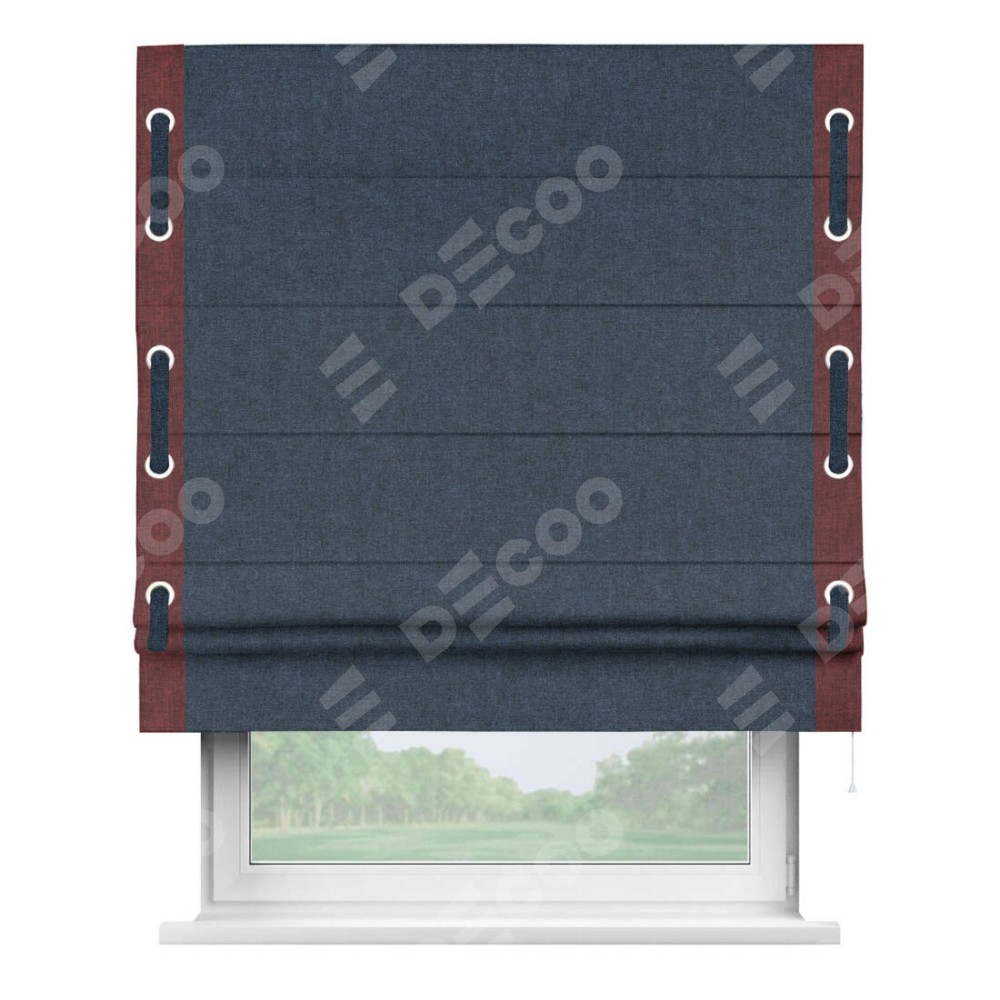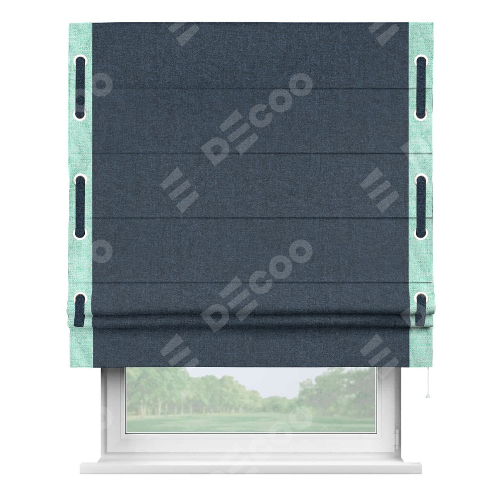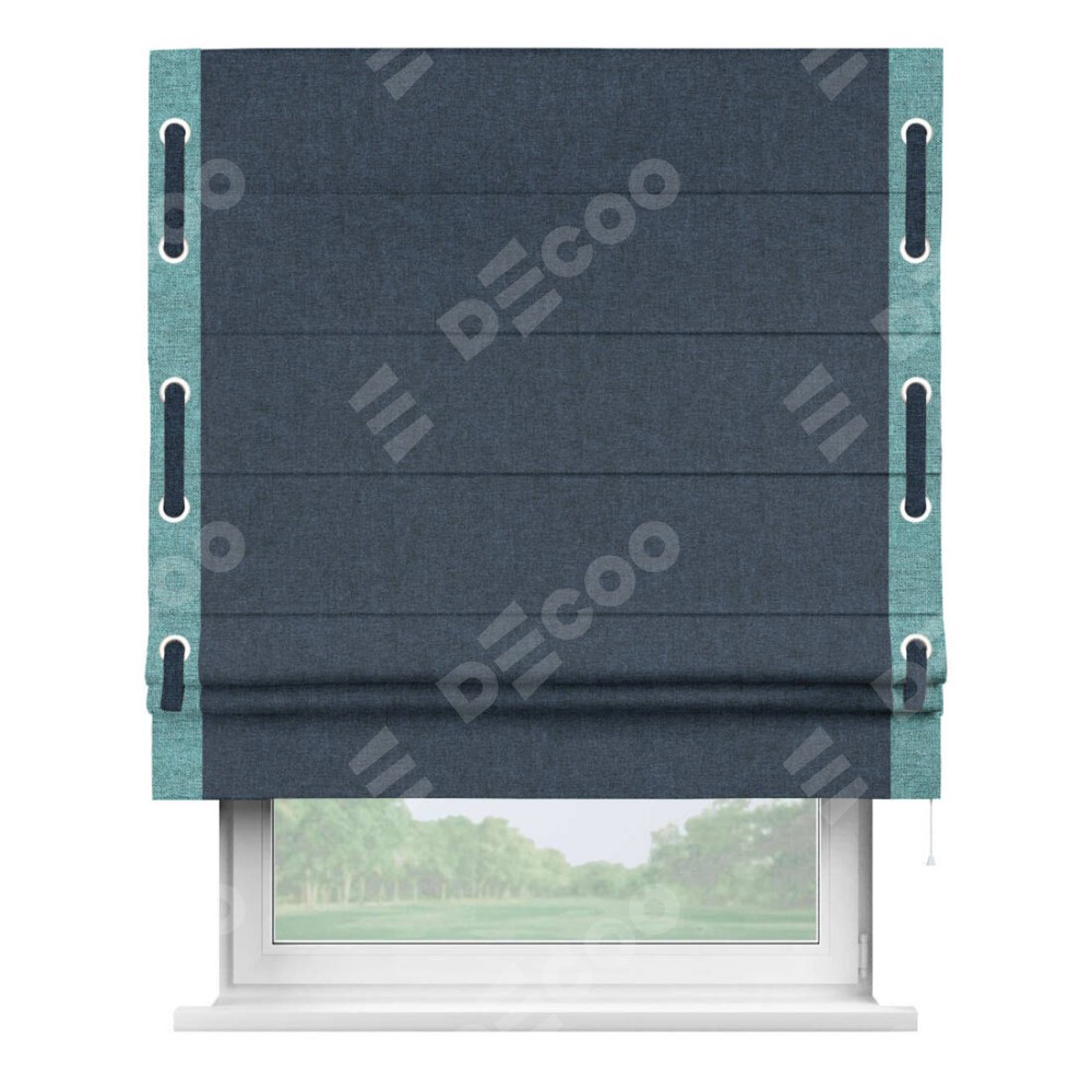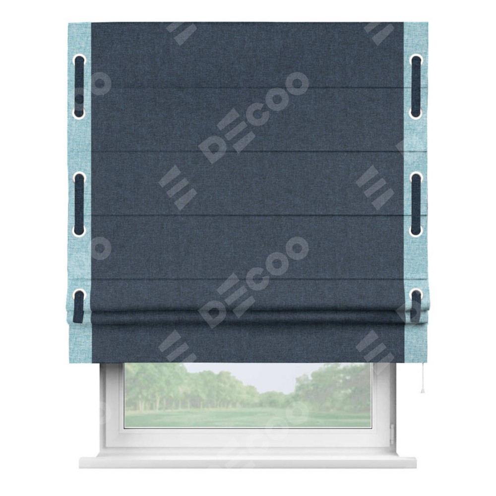 Римская штора «Кортин» для проёма, лён кашемир синий, с кантом Стрим Дуо (люверсы с пояском)