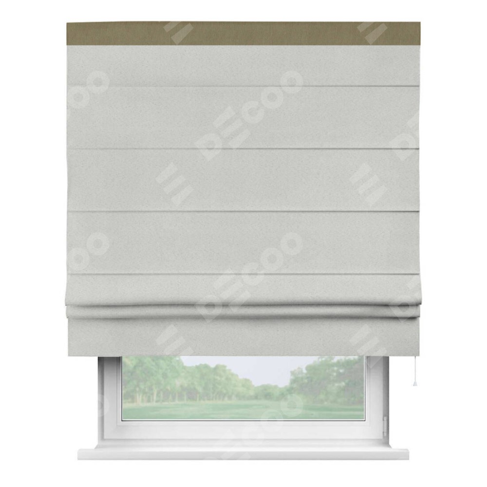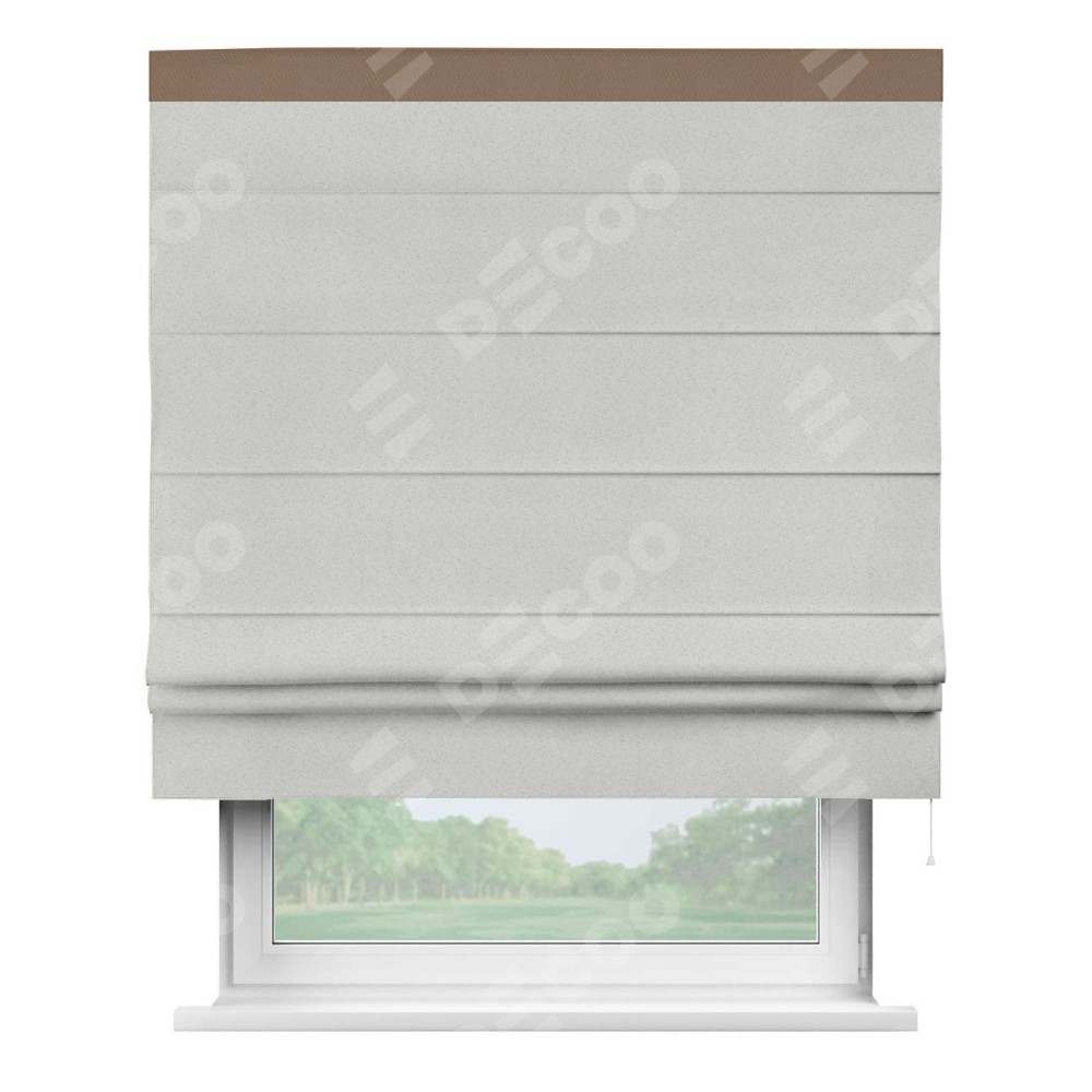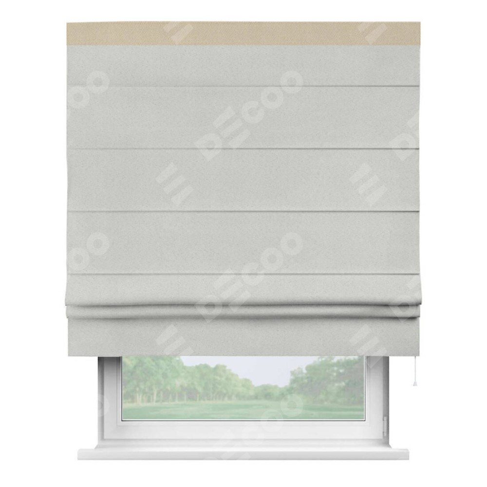 Римская штора пошита из ткани однотонный блэкаут милк, артикул: 23, с отделкой кантом «Кинг» отличается своей необычной особенностью: кант располагается исключительно сверху шторы. Такой дизайн делает акцент на верхней части окна, визуально поднимая потолок и придавая интерьеру более возвышенный и изысканный вид. Отделка кантом на верхней кромке не только украшает штору, но и может служить дополнительной защитой от износа в месте наибольшего контакта с механизмом управления шторой.
