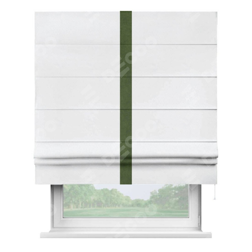 Римская штора пошита из ткани вельвет белоснежный, артикул: 92698, с отделкой кантом «Хайвэй» представляет собой уникальное и смелое дизайнерское решение, где кант расположен вертикально посередине шторы. Этот дизайн не только выделяет штору среди других вариантов оформления окон, но и создает интересный визуальный акцент, привлекая внимание к центру окна и разделяя штору на визуальные зоны. Такой нестандартный подход добавляет динамичности интерьеру и может быть использован для подчеркивания особенностей оформления помещения.