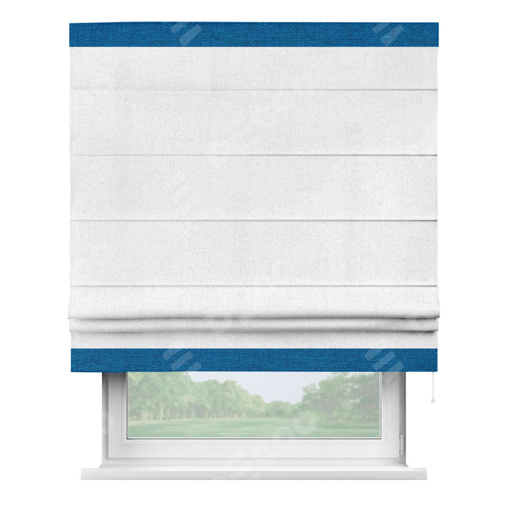 Римская штора пошита из ткани лён белоснежный, артикул: 95632, с отделкой кантом «Горизонт» предлагает уникальное дизайнерское решение, при котором кант располагается только вверху и снизу шторы. Такое решение делает акцент на горизонтальных линиях, визуально расширяя пространство и придавая окну более строгий и организованный вид. Отделка кантом в этих ключевых местах не только украшает штору, но и способствует её долговечности, защищая наиболее уязвимые к износу края.