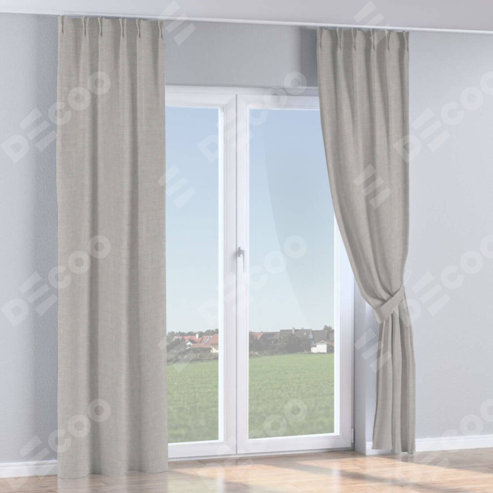 Комплект прямых штор, от производителя «Cortin», пошиты из ткани лён серый, артикул ткани 91410. С изнаночной стороны в верхней части штор пристрачивается шторная лента с декоративными складками «Кустик». Для создания элегантных складок прямые шторы шьются по стандарту с коэффициентом 1:2 (на 100 см. ширины проёма 200 см. ширины ткани).