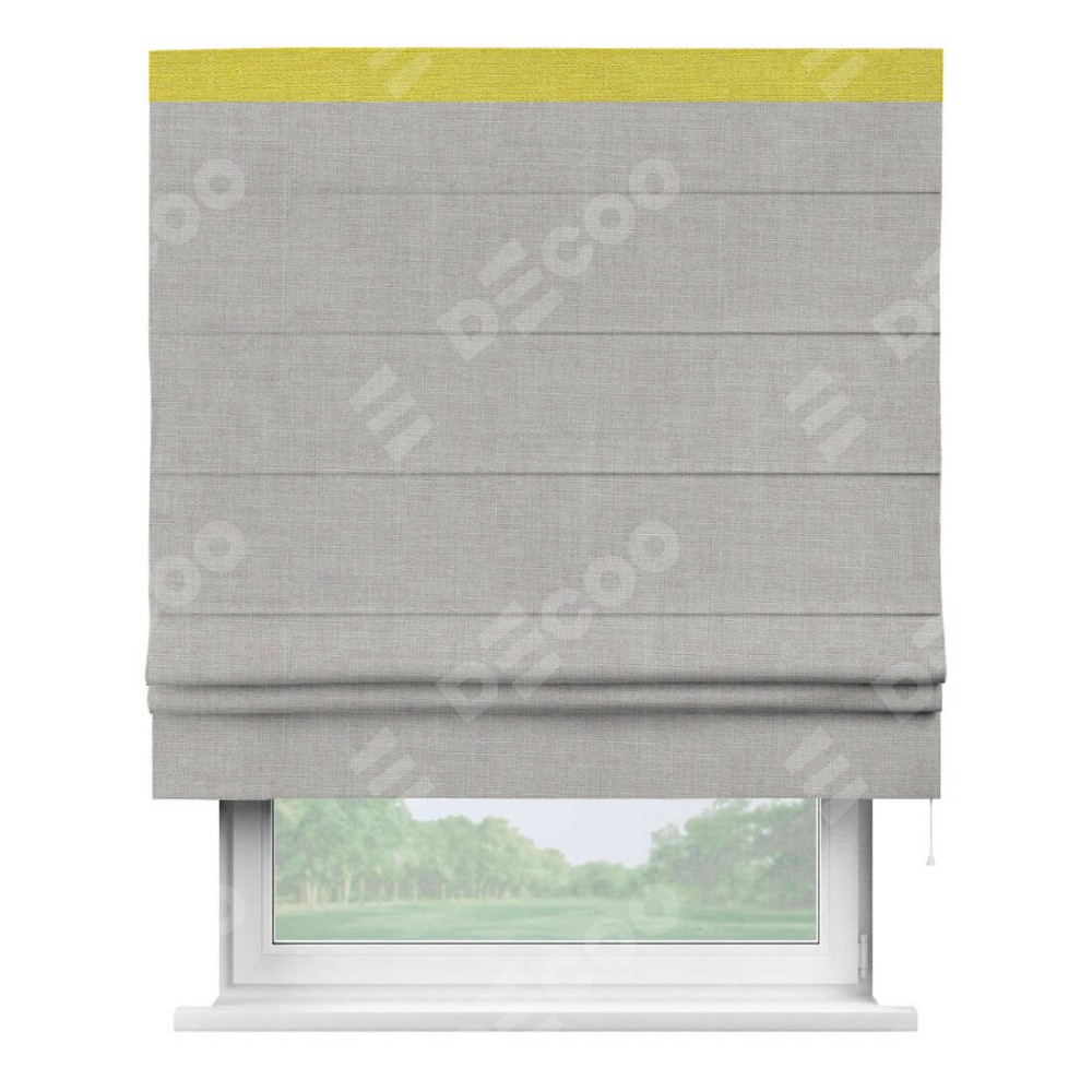 Римская штора пошита из ткани лён серый, артикул: 91410, с отделкой кантом «Кинг» отличается своей необычной особенностью: кант располагается исключительно сверху шторы. Такой дизайн делает акцент на верхней части окна, визуально поднимая потолок и придавая интерьеру более возвышенный и изысканный вид. Отделка кантом на верхней кромке не только украшает штору, но и может служить дополнительной защитой от износа в месте наибольшего контакта с механизмом управления шторой.