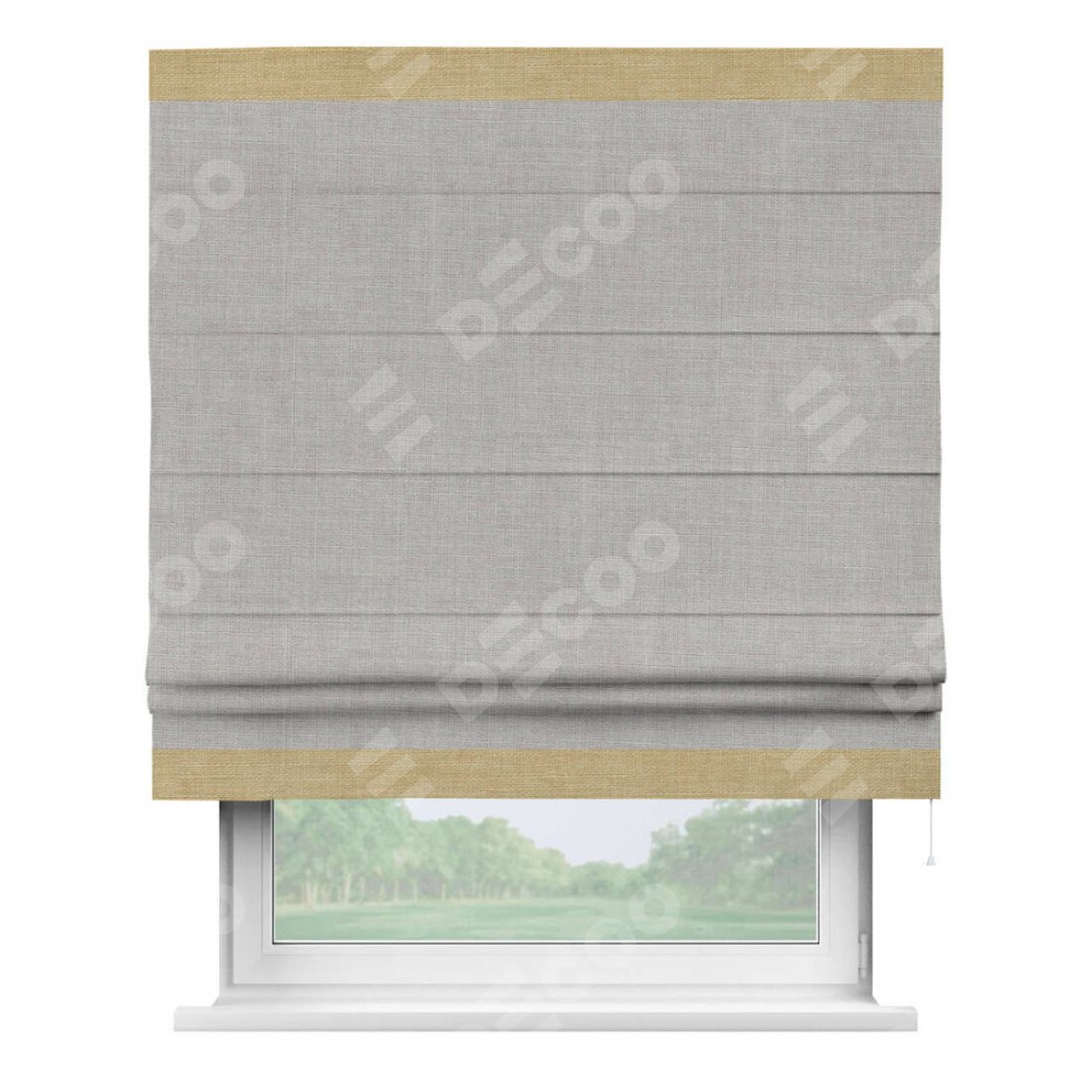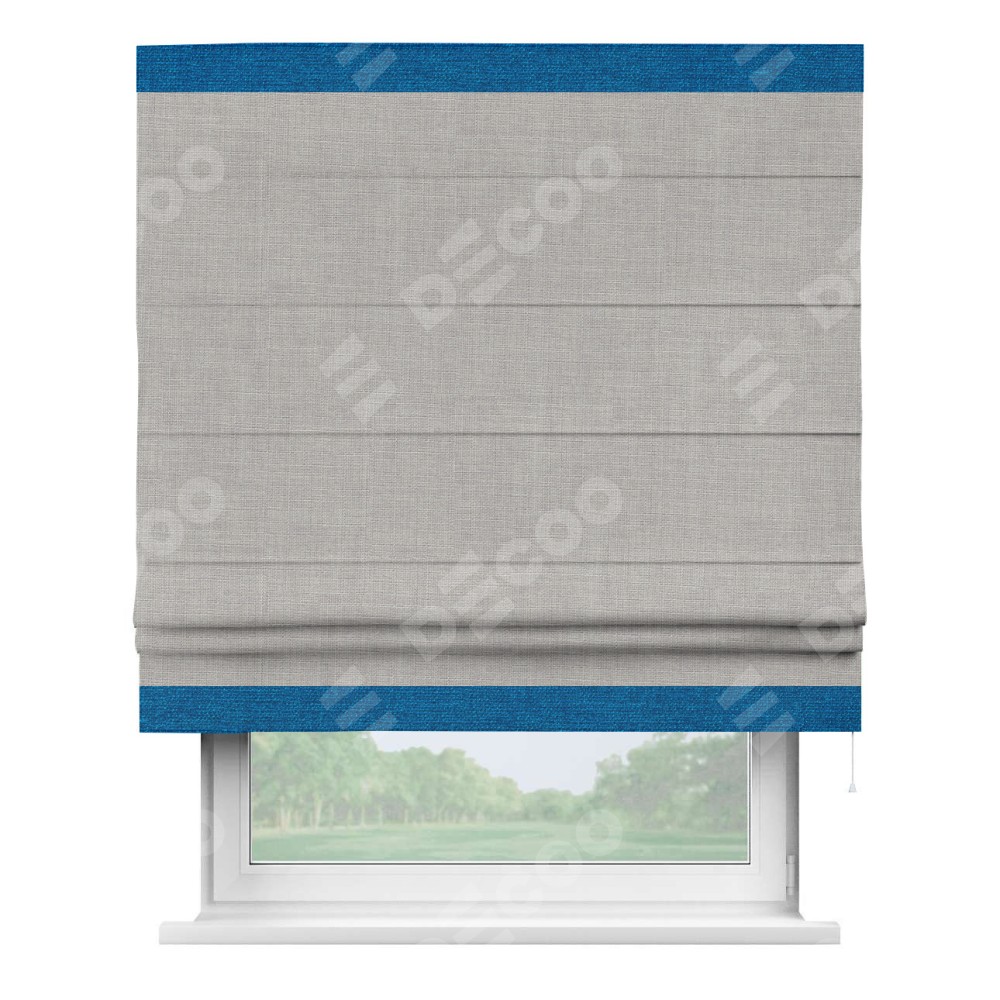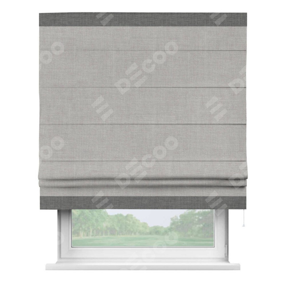 Римская штора пошита из ткани лён серый, артикул: 91410, с отделкой кантом «Горизонт» предлагает уникальное дизайнерское решение, при котором кант располагается только вверху и снизу шторы. Такое решение делает акцент на горизонтальных линиях, визуально расширяя пространство и придавая окну более строгий и организованный вид. Отделка кантом в этих ключевых местах не только украшает штору, но и способствует её долговечности, защищая наиболее уязвимые к износу края.