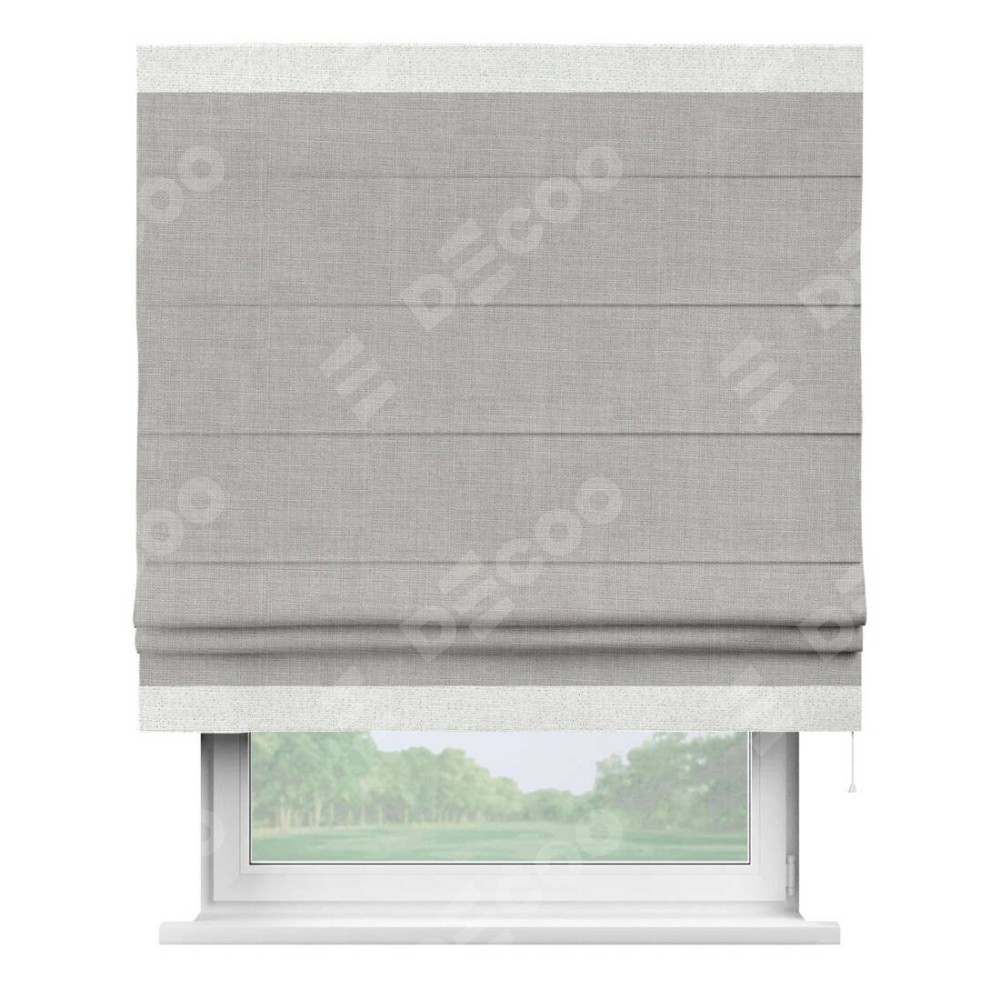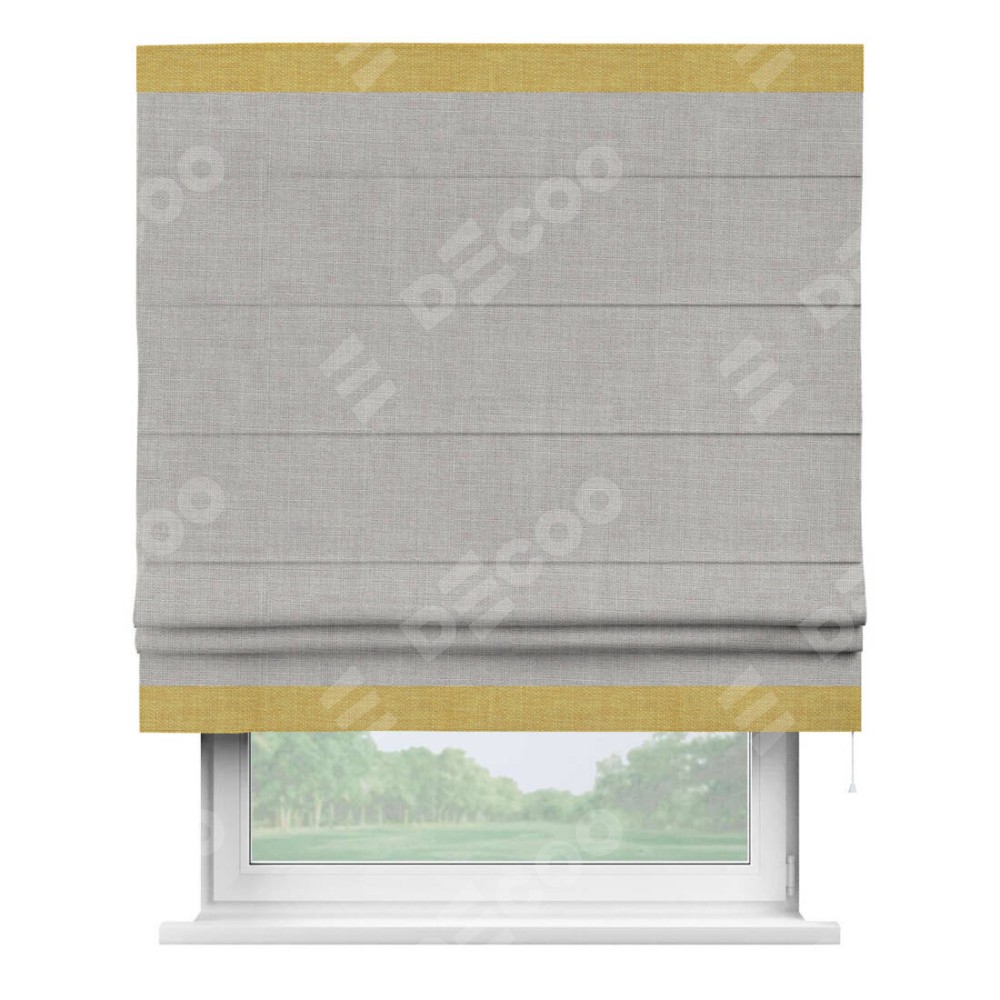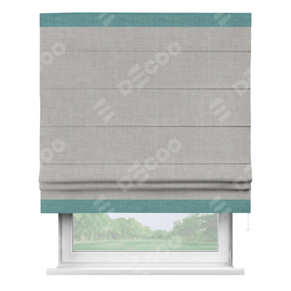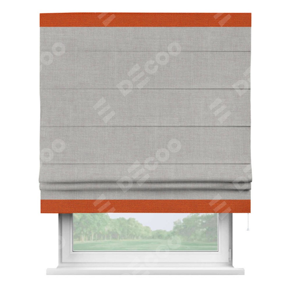 Римская штора пошита из ткани лён серый, артикул: 91410, с отделкой кантом «Горизонт» предлагает уникальное дизайнерское решение, при котором кант располагается только вверху и снизу шторы. Такое решение делает акцент на горизонтальных линиях, визуально расширяя пространство и придавая окну более строгий и организованный вид. Отделка кантом в этих ключевых местах не только украшает штору, но и способствует её долговечности, защищая наиболее уязвимые к износу края.