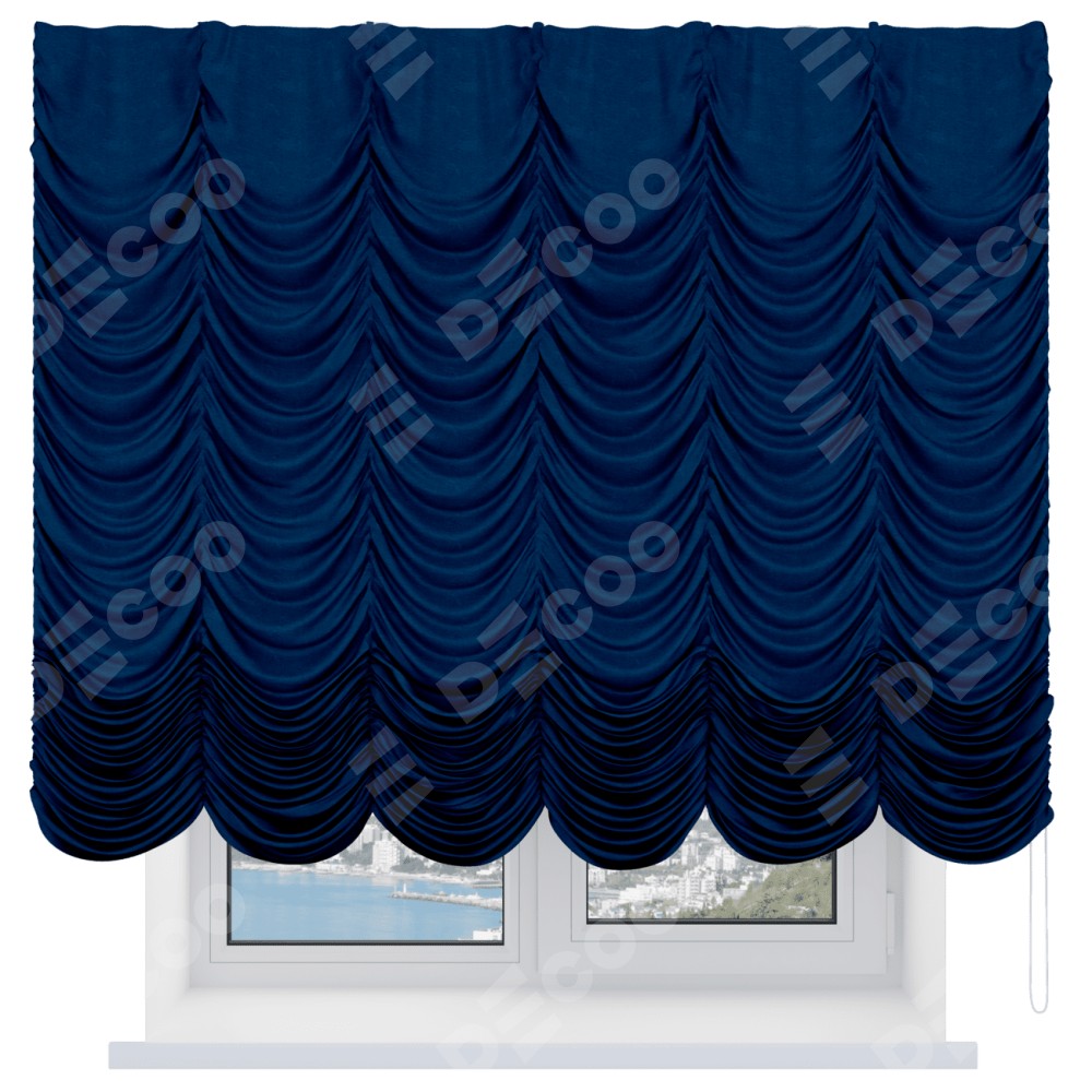 Французская штора производителя «Cortin», используется для проёма, пошита из ткани софт однотонный синий, артикул ткани 42937. Имеет универсальный механизм и подходит для монтажа: на потолок и на стену.