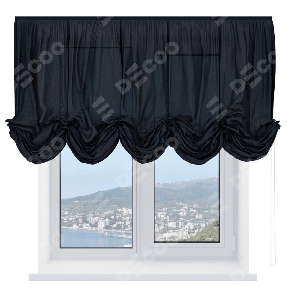 Австрийская штора производителя «Cortin», используется для проёма, пошита из ткани лён черный, артикул ткани 140815. Имеет универсальный механизм и подходит для монтажа: на потолок и на стену.