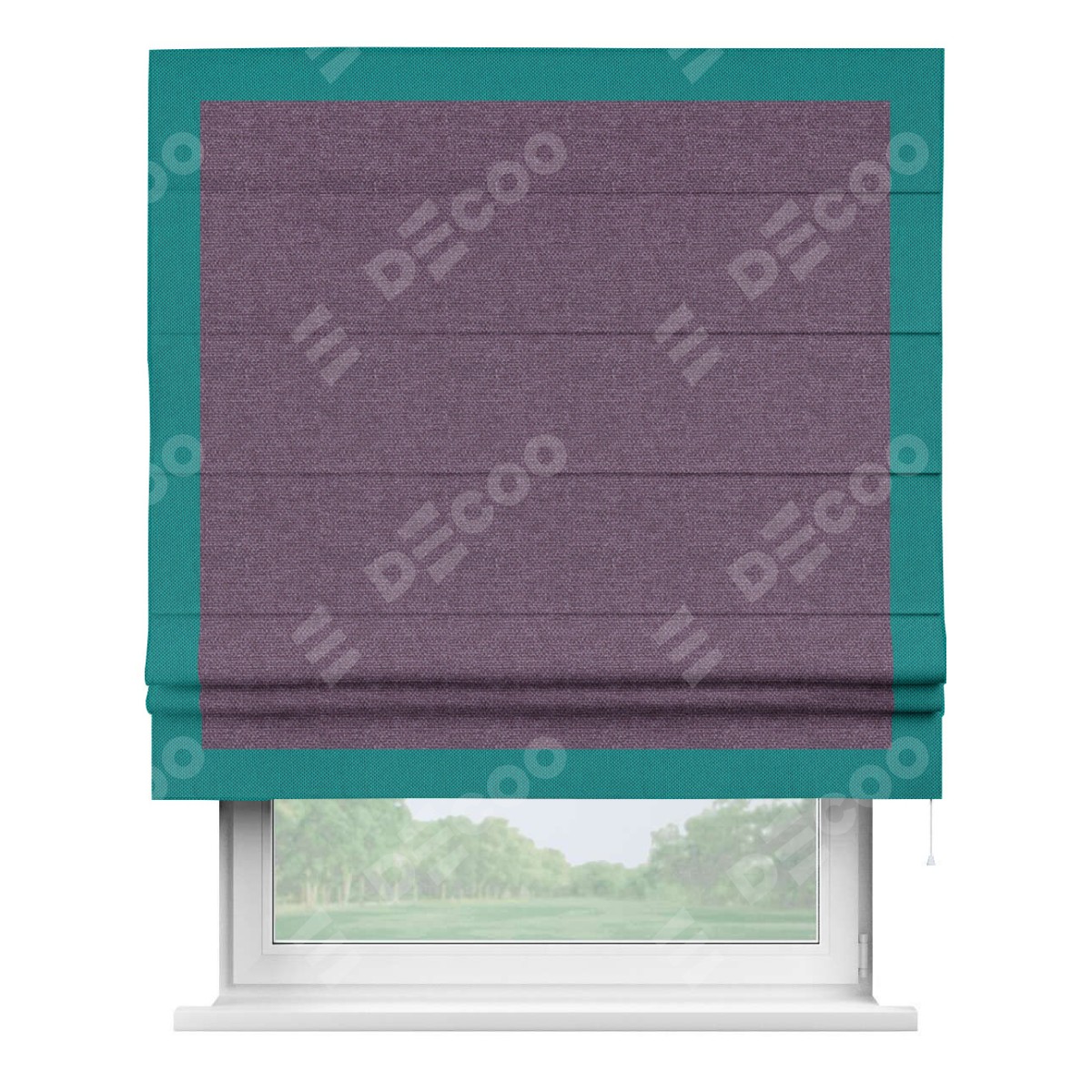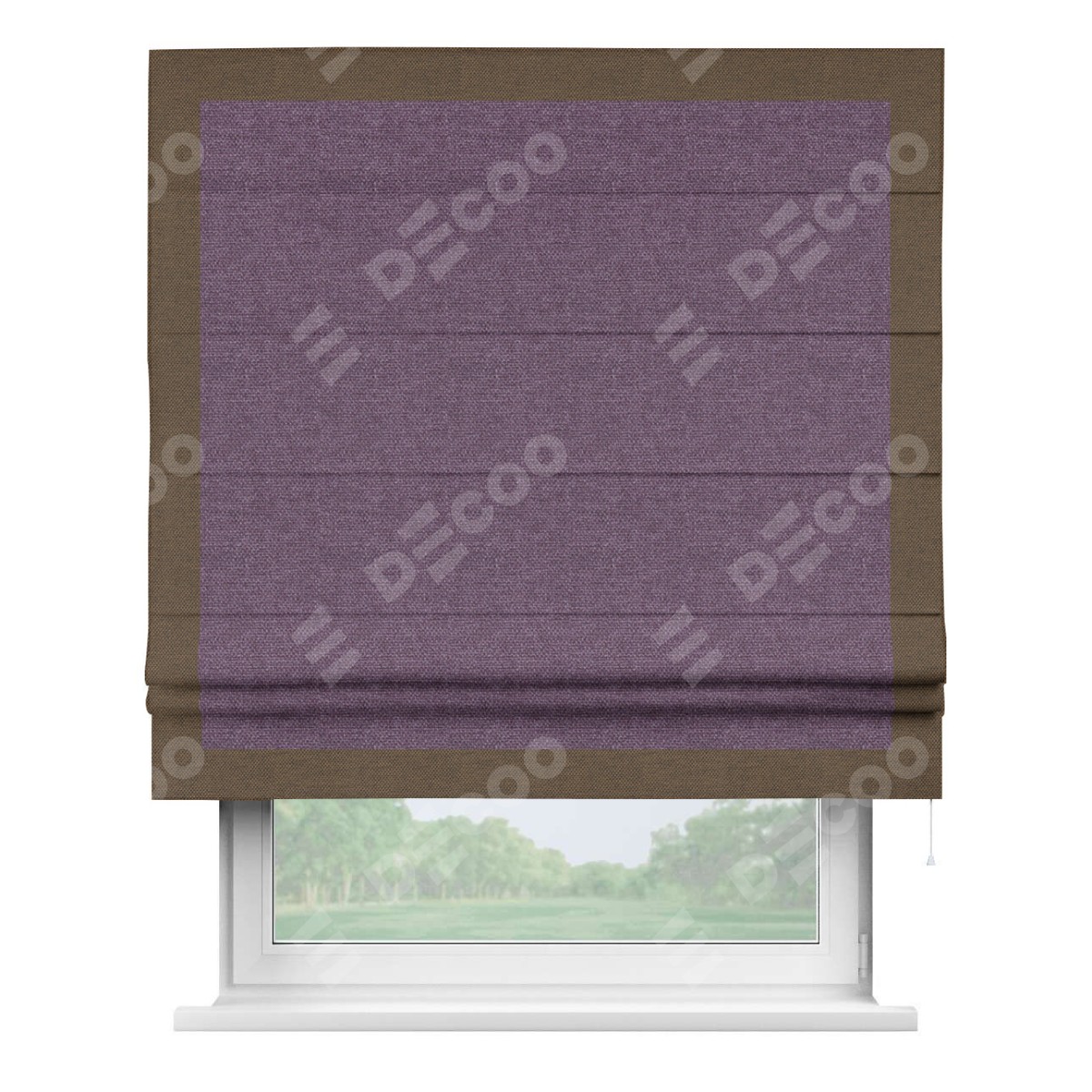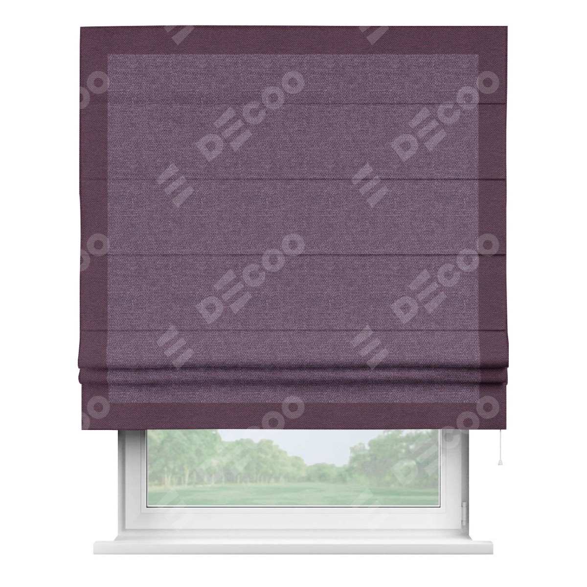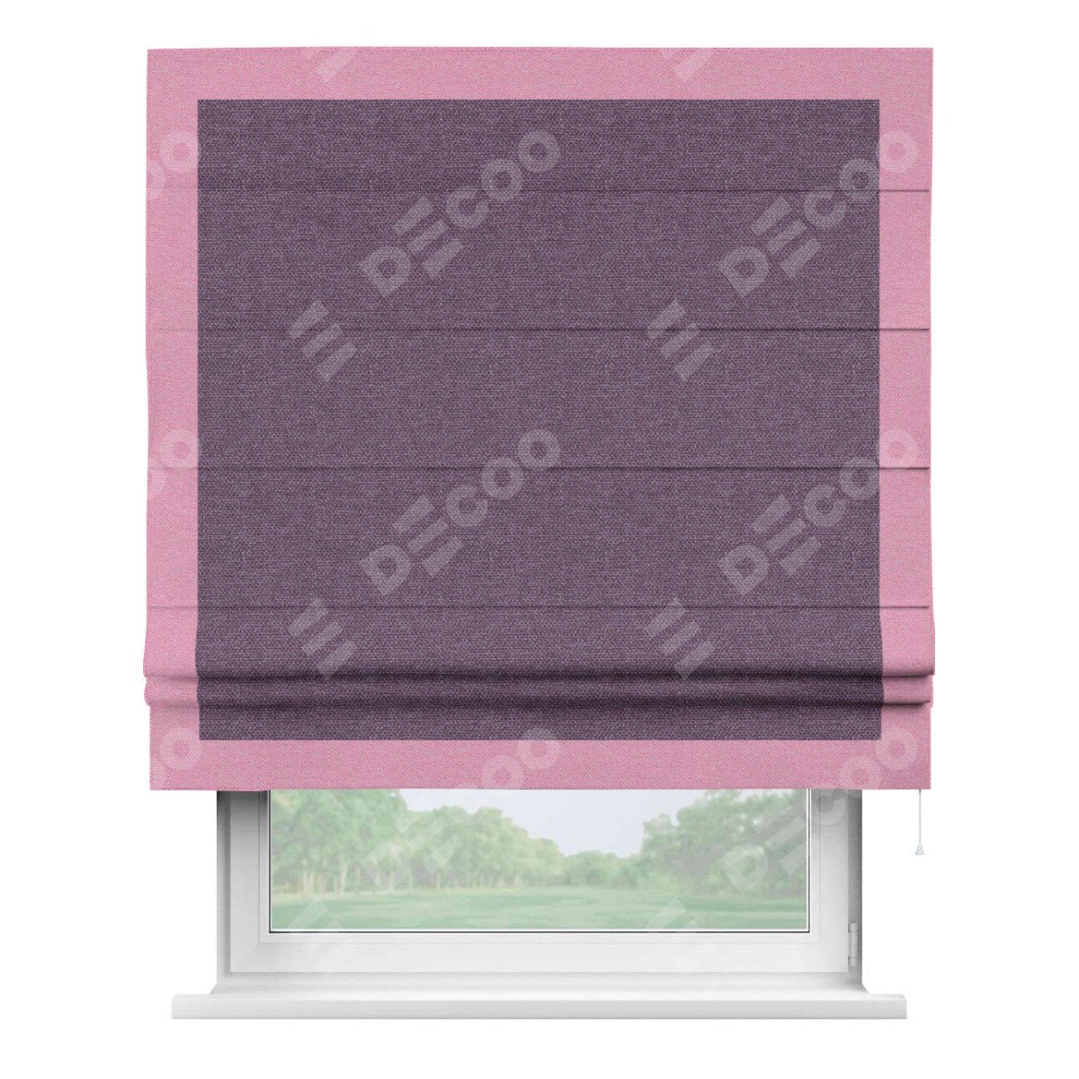 Римская штора производителя «Cortin», используется для проёма, пошита из ткани лён димаут брусника, артикул 16. Отделка шторы кантом «Чесс», ткань для канта используется из льна димаут разной расцветки на выбор. Имеет универсальный механизм и подходит для монтажа: на потолок, на стену и в нишу.