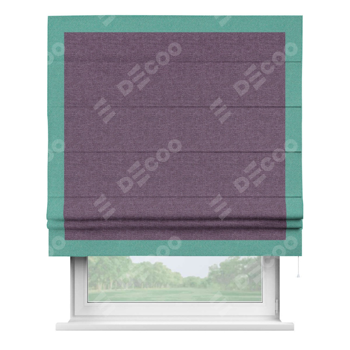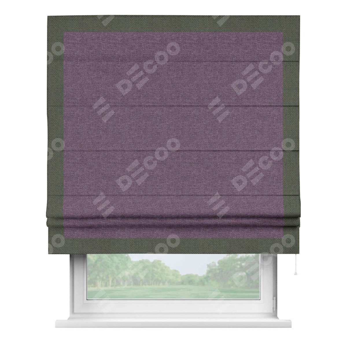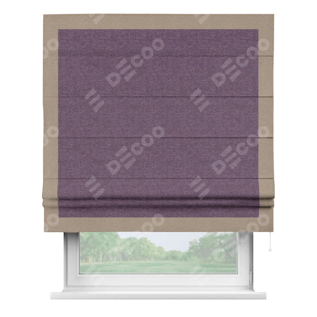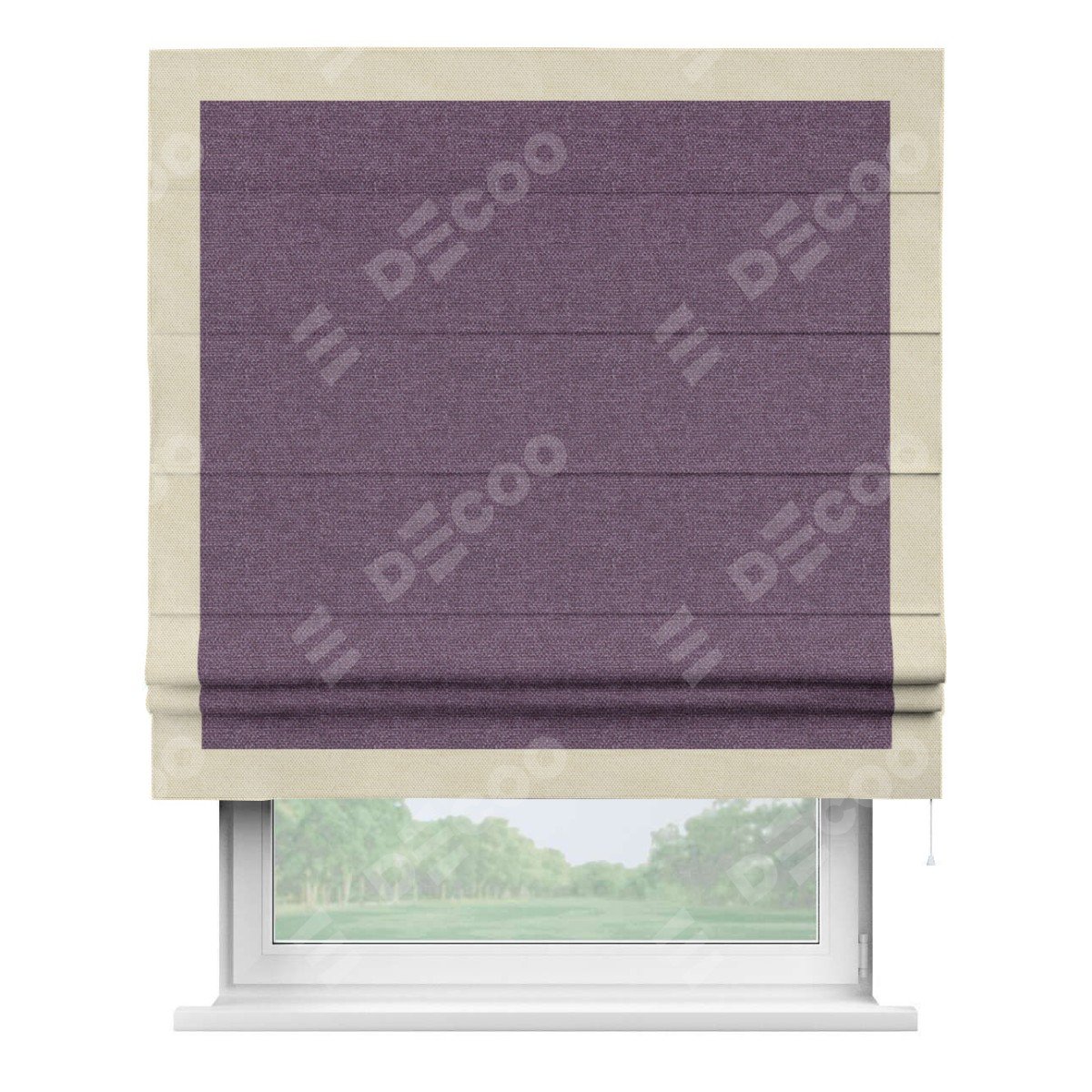 Римская штора производителя «Cortin», используется для проёма, пошита из ткани лён димаут брусника, артикул 16. Отделка шторы кантом «Чесс», ткань для канта используется из льна димаут разной расцветки на выбор. Имеет универсальный механизм и подходит для монтажа: на потолок, на стену и в нишу.