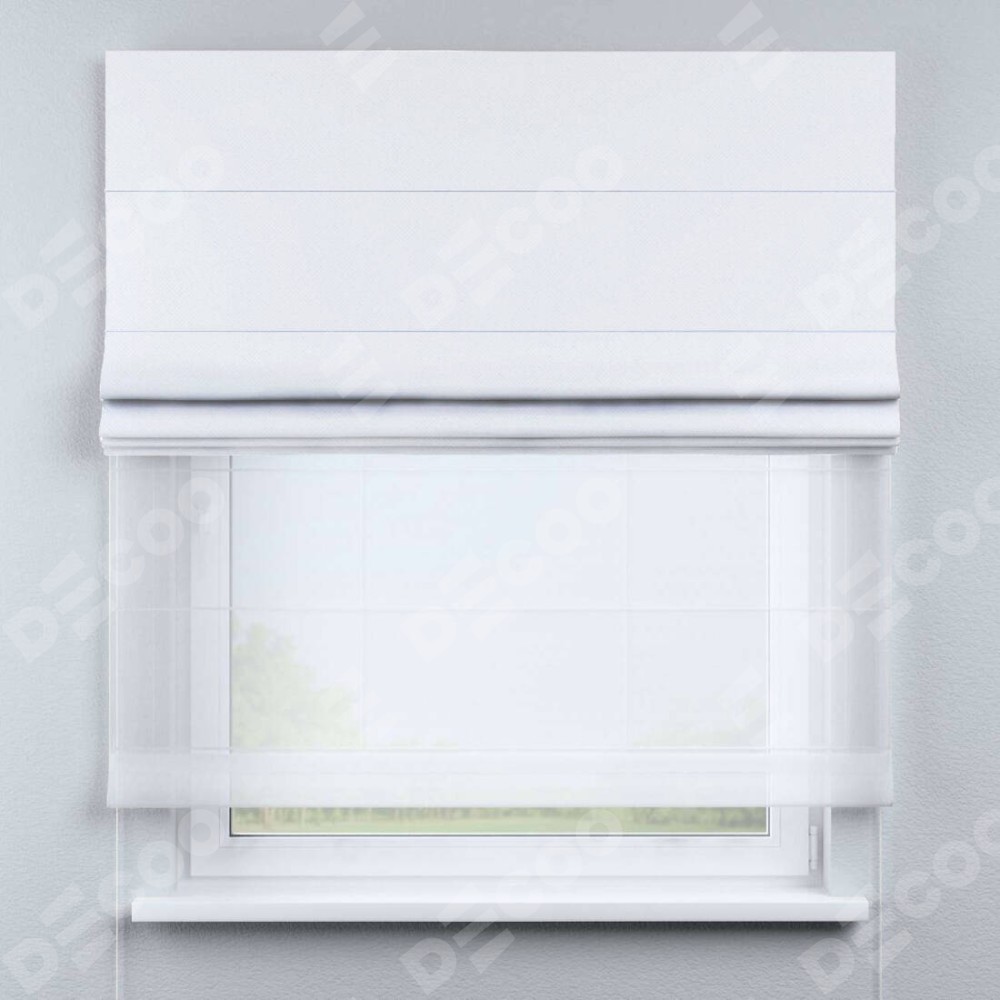 Двойная римская штора «День-ночь» от производителя Cortin предназначена для использования в проёмах. Эта штора уникальна тем, что состоит из двух полотен. На лицевой стороне находится лён димаут белый (артикул: 28), обеспечивающий эффективное затемнение. В комплект также входит вторая ткань — легкий белый тюль (артикул: V-01), который добавляет изящества и легкости оформлению окна. Кроме того, доступны и другие разновидности ткани тюль, выбор которых доступен по  ссылке .