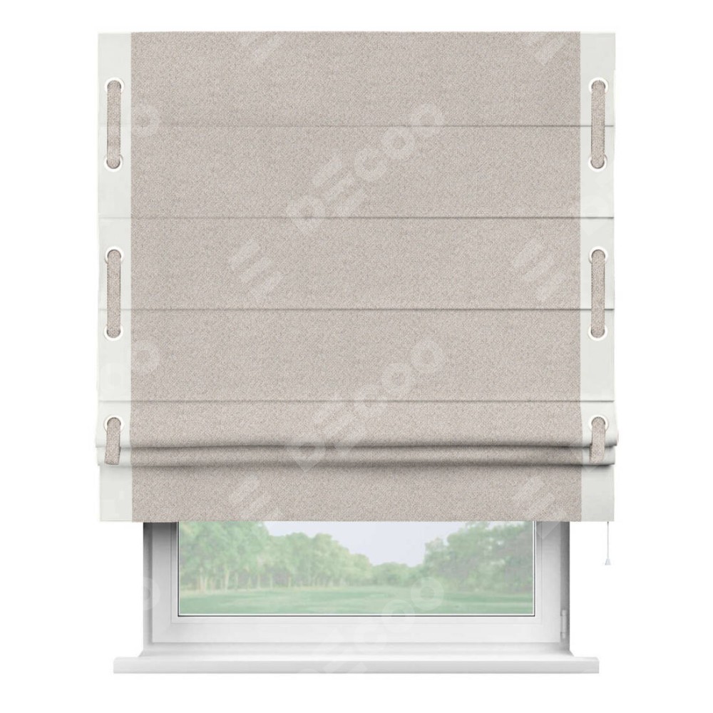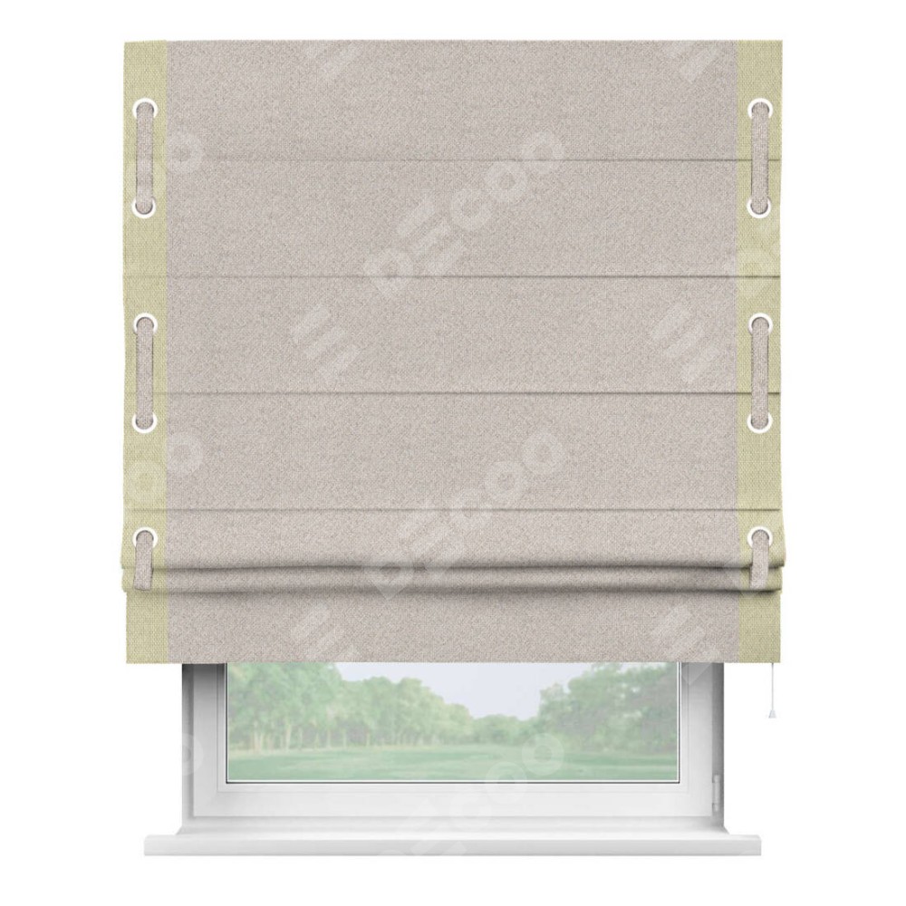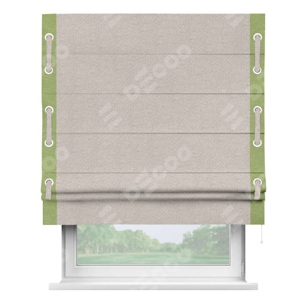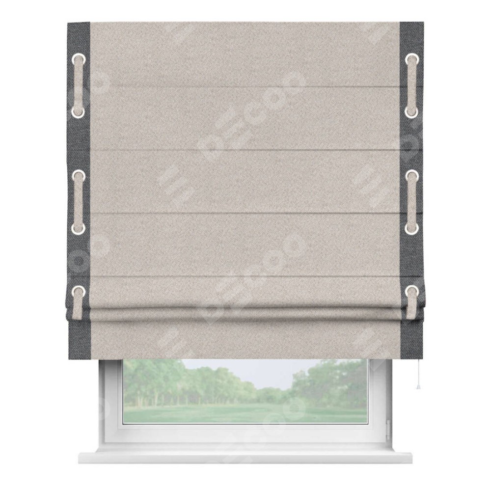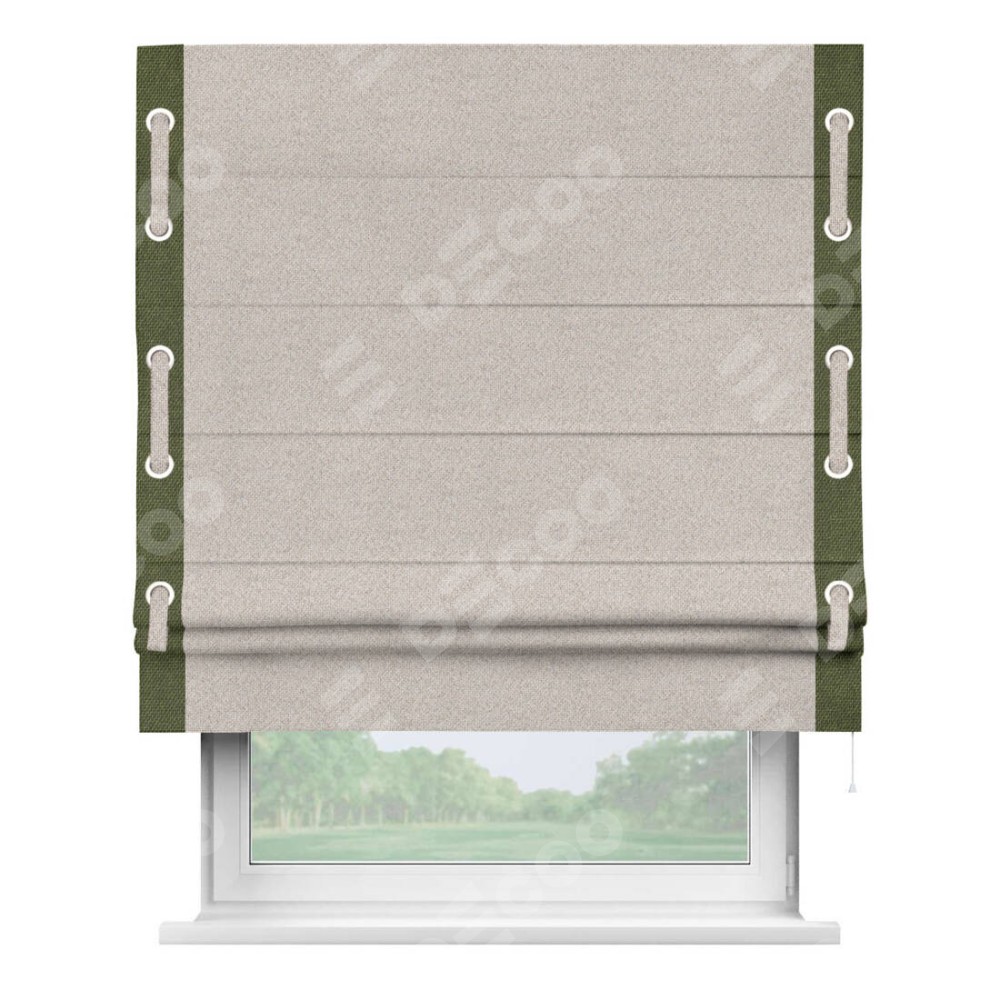 Римская штора «Кортин» для проема, лён димаут бежевый с кантом Стрим Дуо (люверсы с пояском)