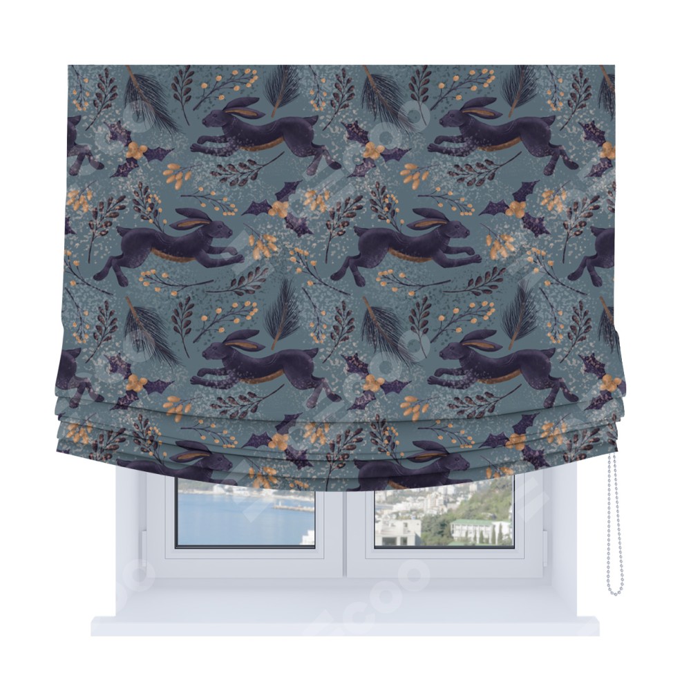 Классическая римская штора производителя «Cortin», пошита из ткани дарк арт зайцы, артикул:. Имеет универсальный механизм и подходит для монтажа: на потолок, на стену и в нишу.