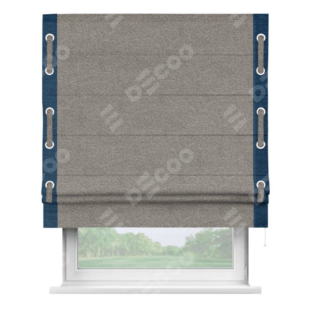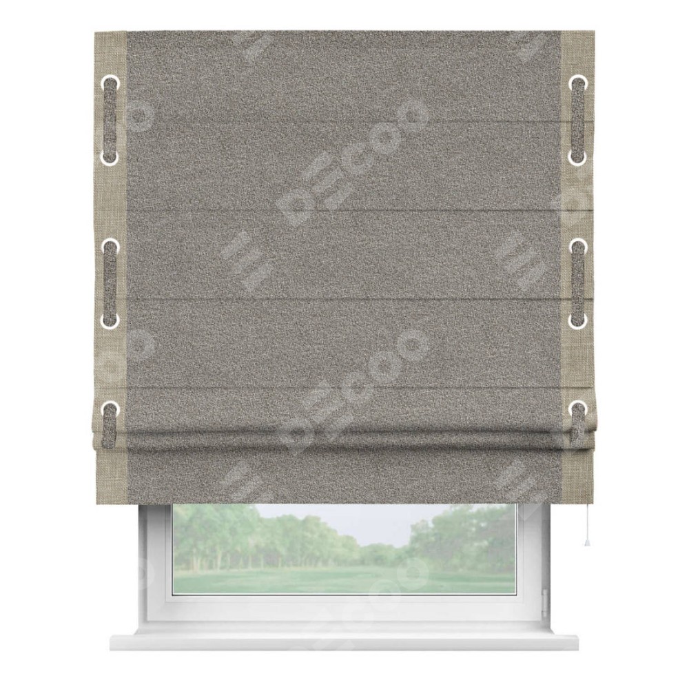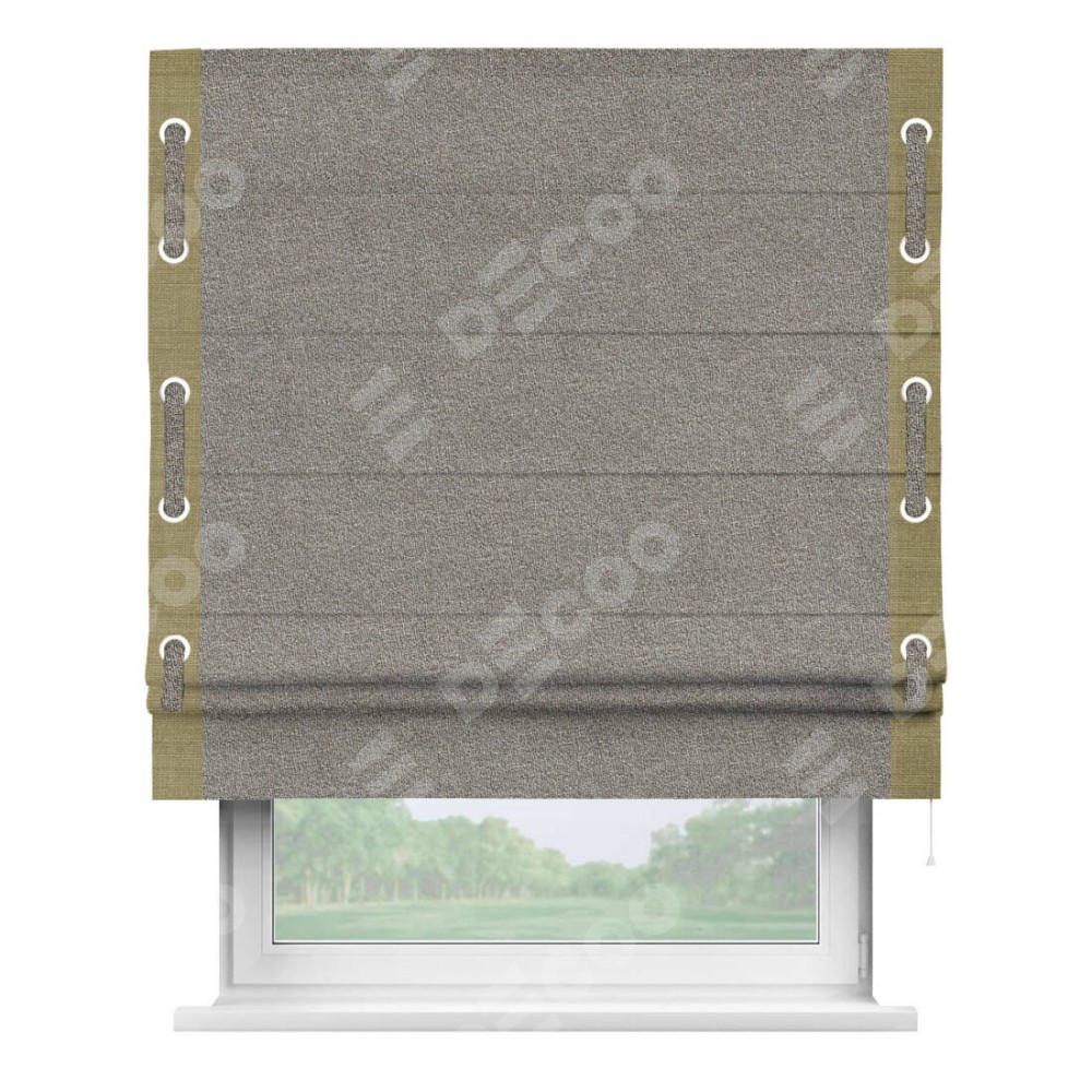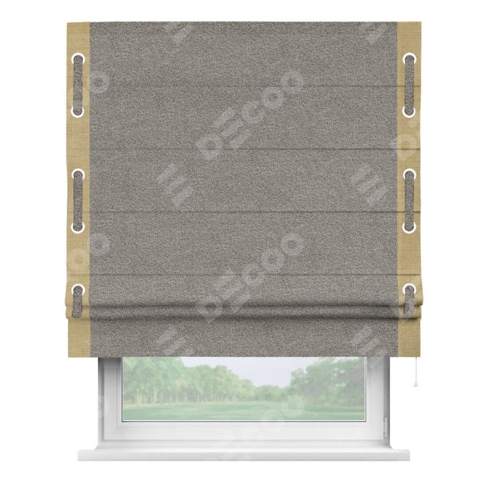 Римская штора «Кортин» для проёма, лён меланж натуральный, с кантом Стрим Дуо (люверсы с пояском)