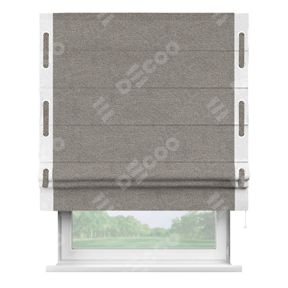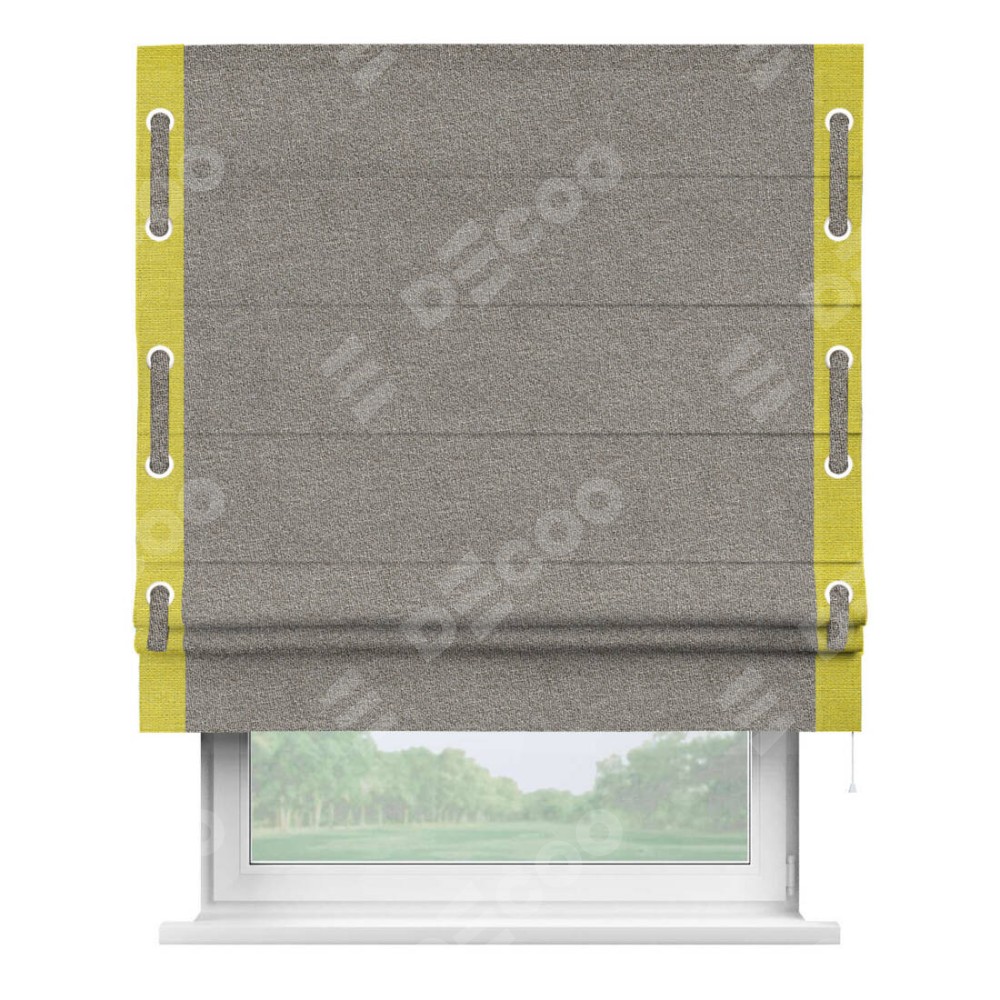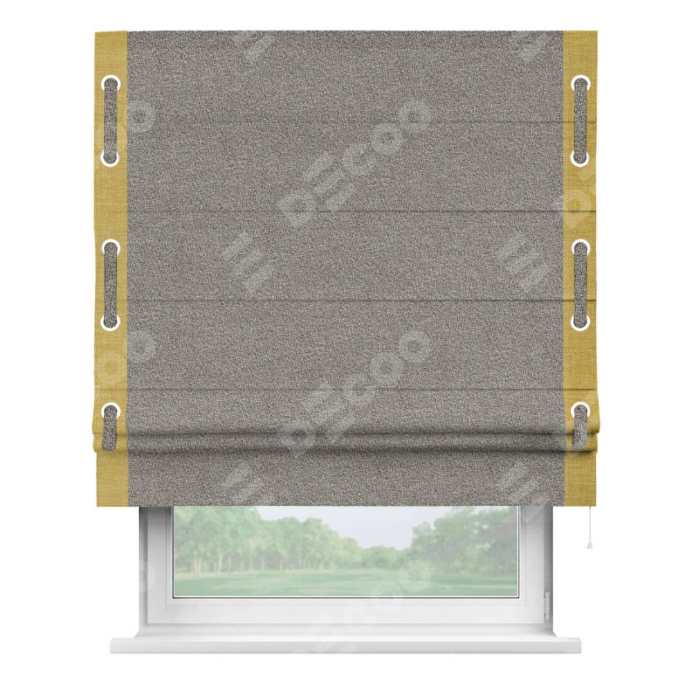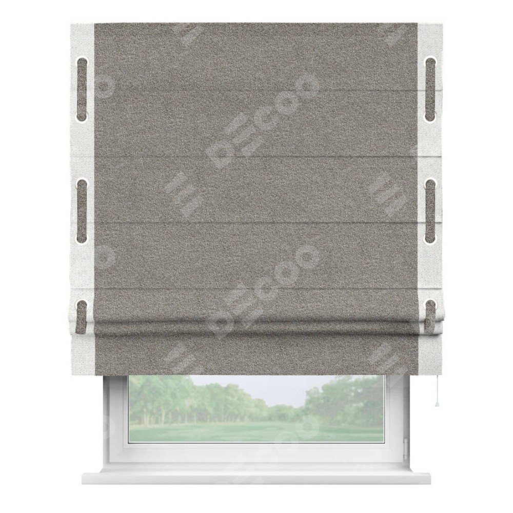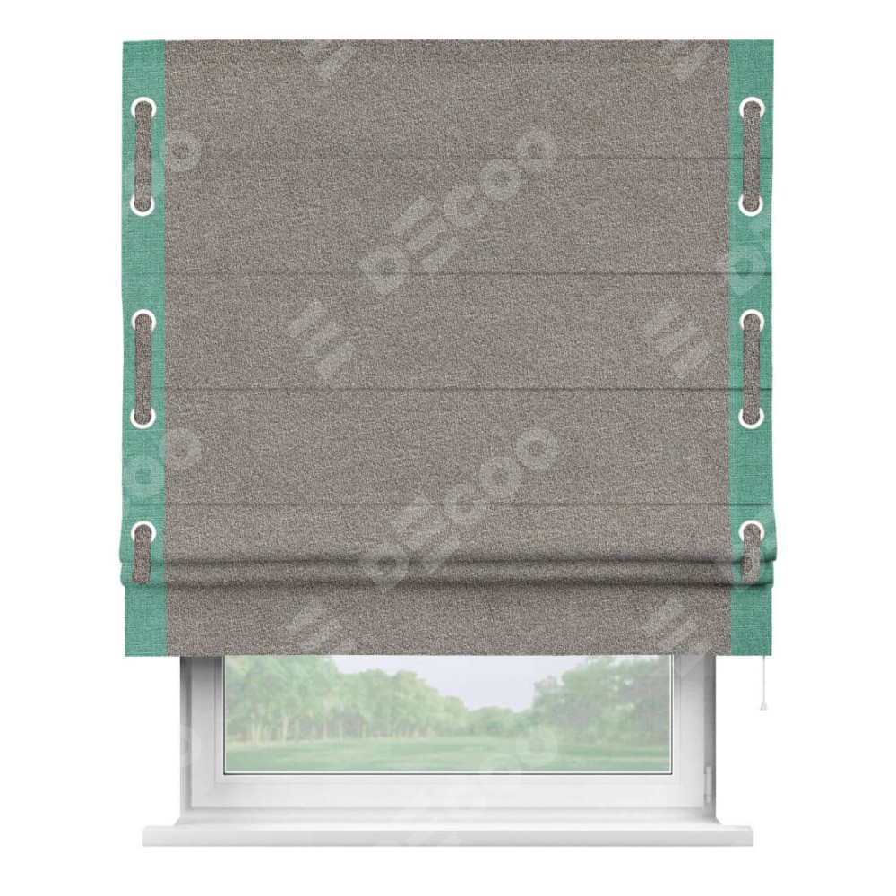 Римская штора «Кортин» для проёма, лён меланж натуральный, с кантом Стрим Дуо (люверсы с пояском)