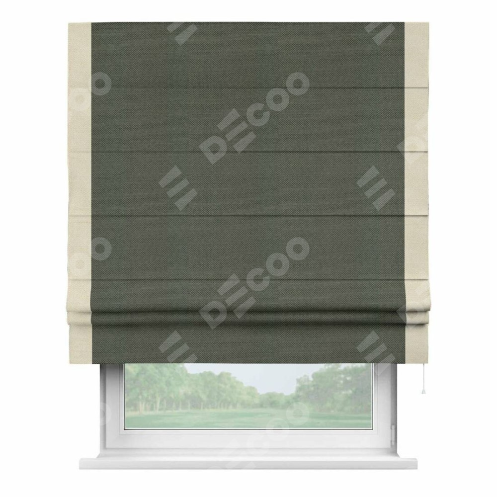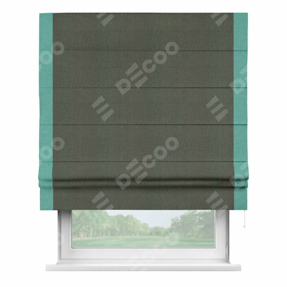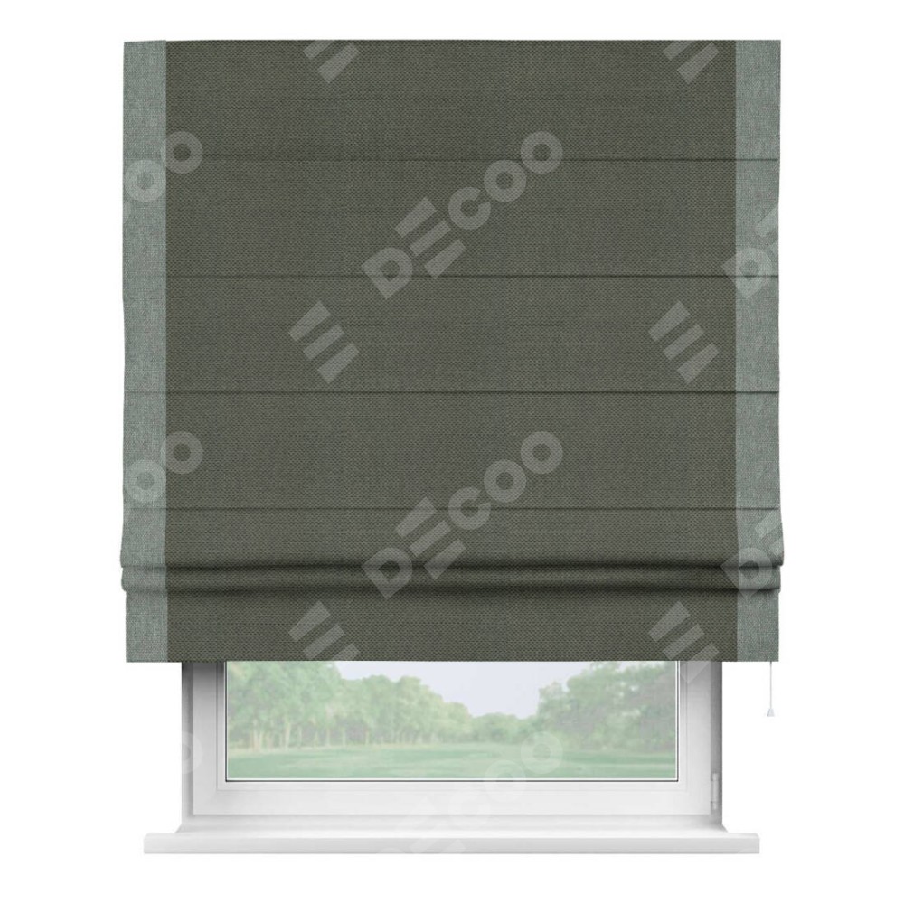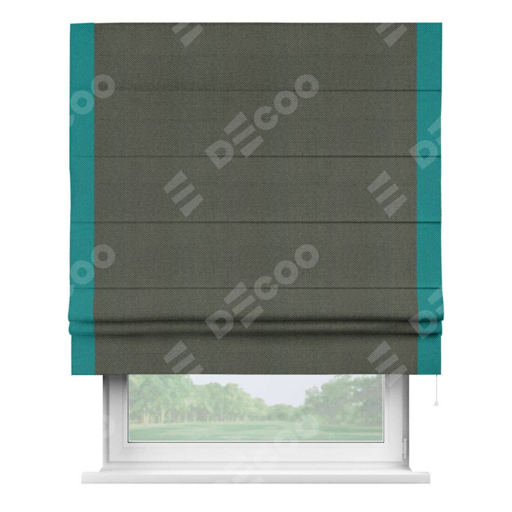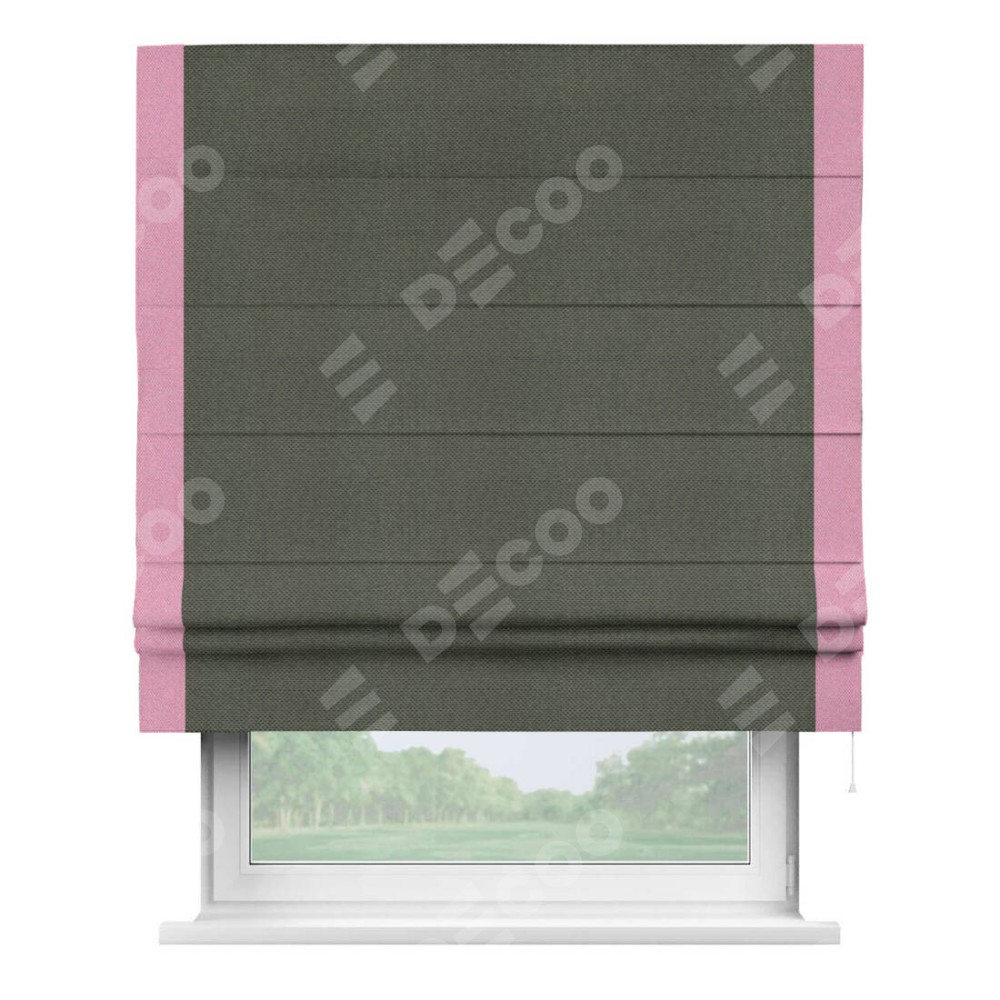 Римская штора производителя «Cortin», используется для проёма, пошита из ткани лён димаут графит, артикул 27. Отделка шторы кантом «Стрим Дуо», ткань для канта используется из льна димаут разной расцветки на выбор. Имеет универсальный механизм и подходит для монтажа: на потолок, на стену и в нишу.
