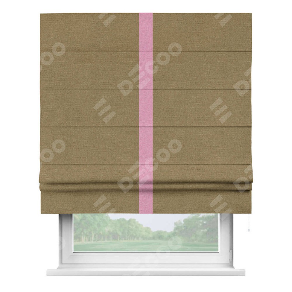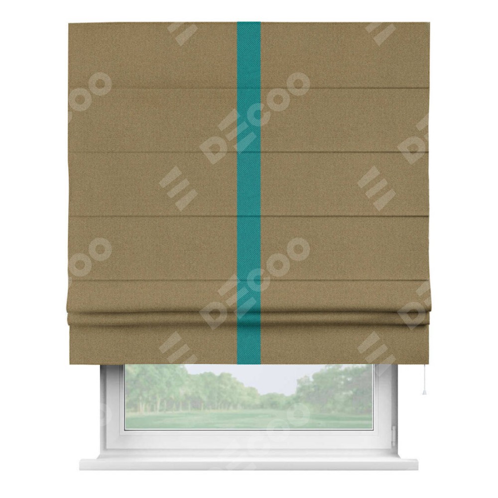 Римская штора производителя «Cortin», используется для проёма, пошита из ткани лён димаут оливковый, артикул 16243. Отделка шторы кантом «Хайвэй», ткань для канта используется из льна димаут разной расцветки на выбор. Имеет универсальный механизм и подходит для монтажа: на потолок, на стену и в нишу.