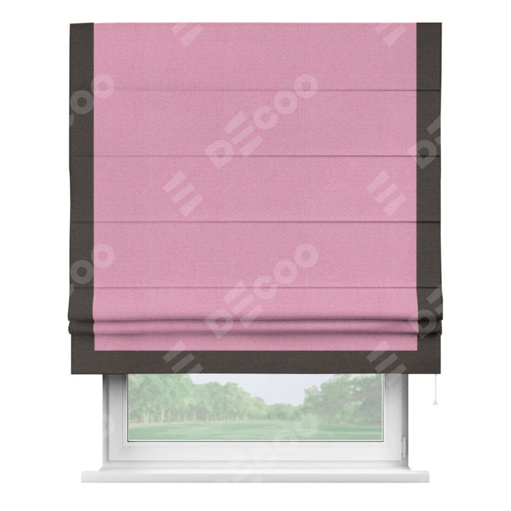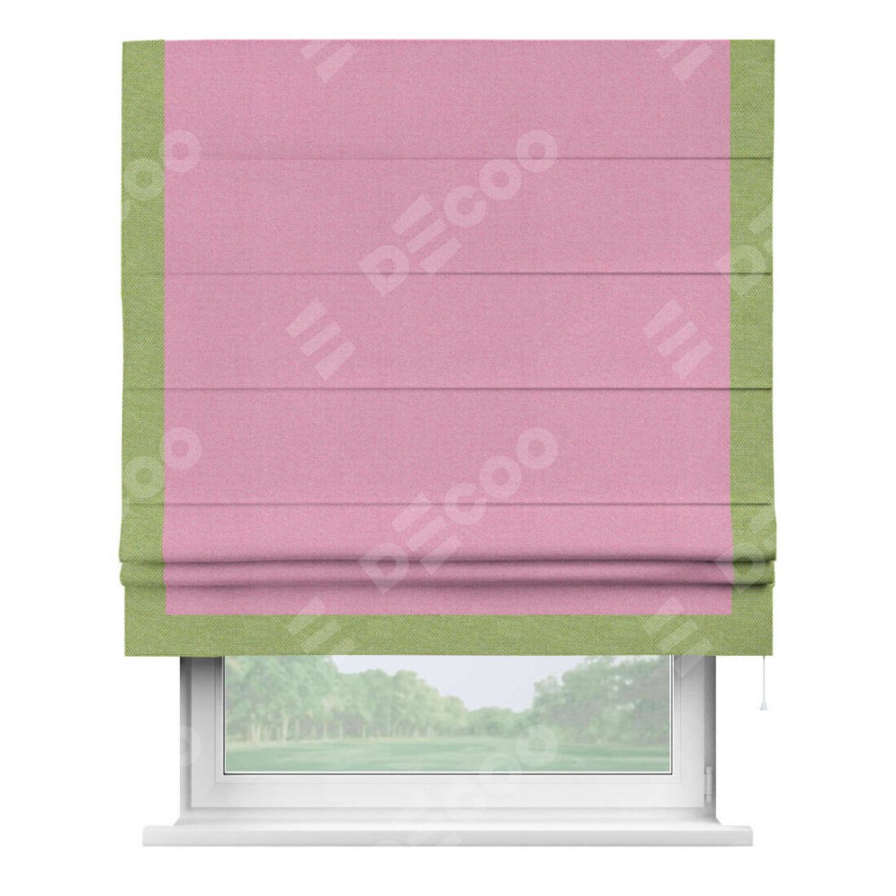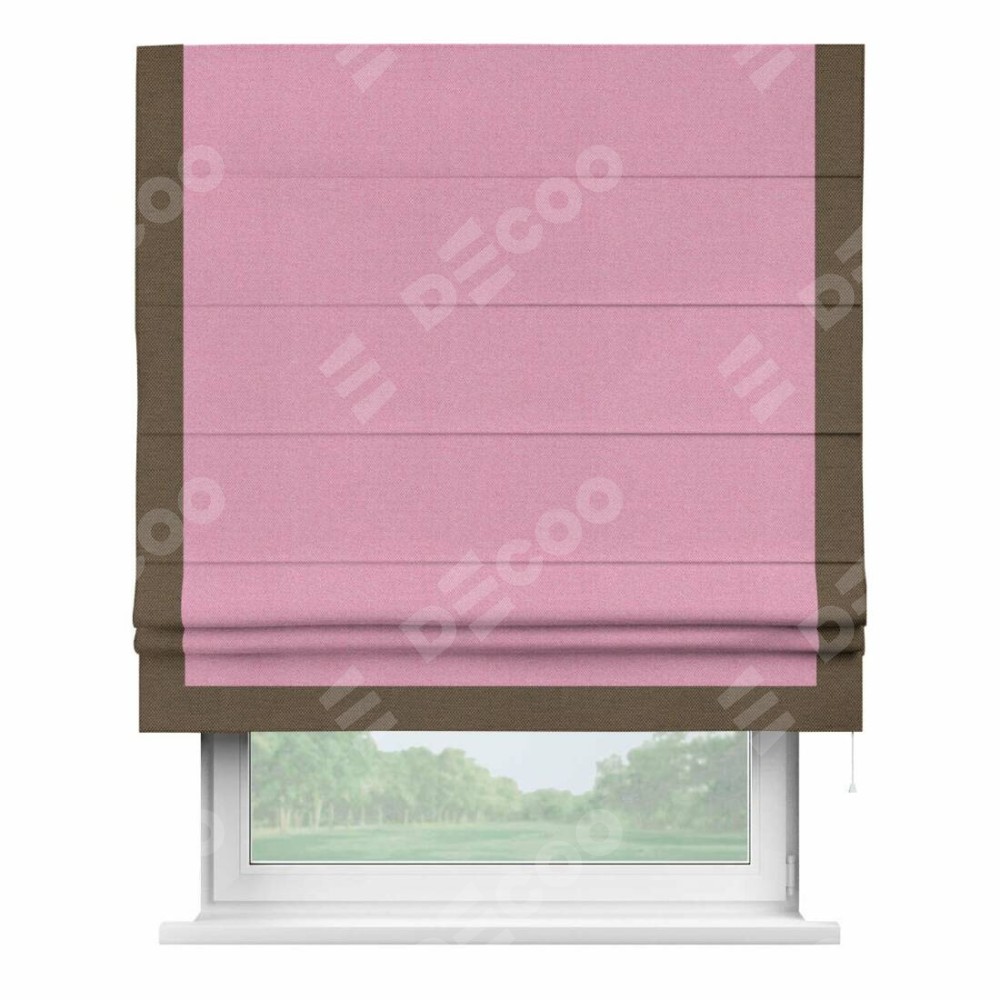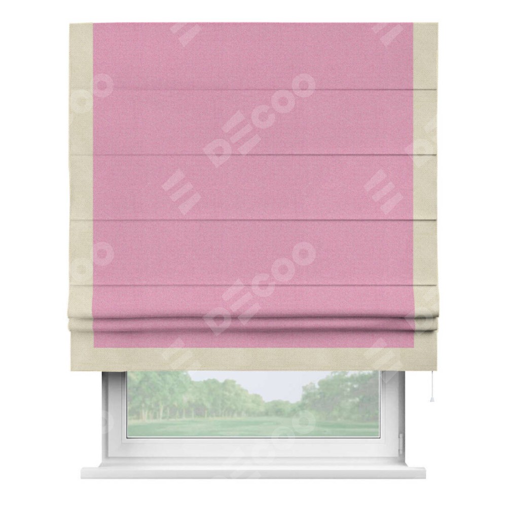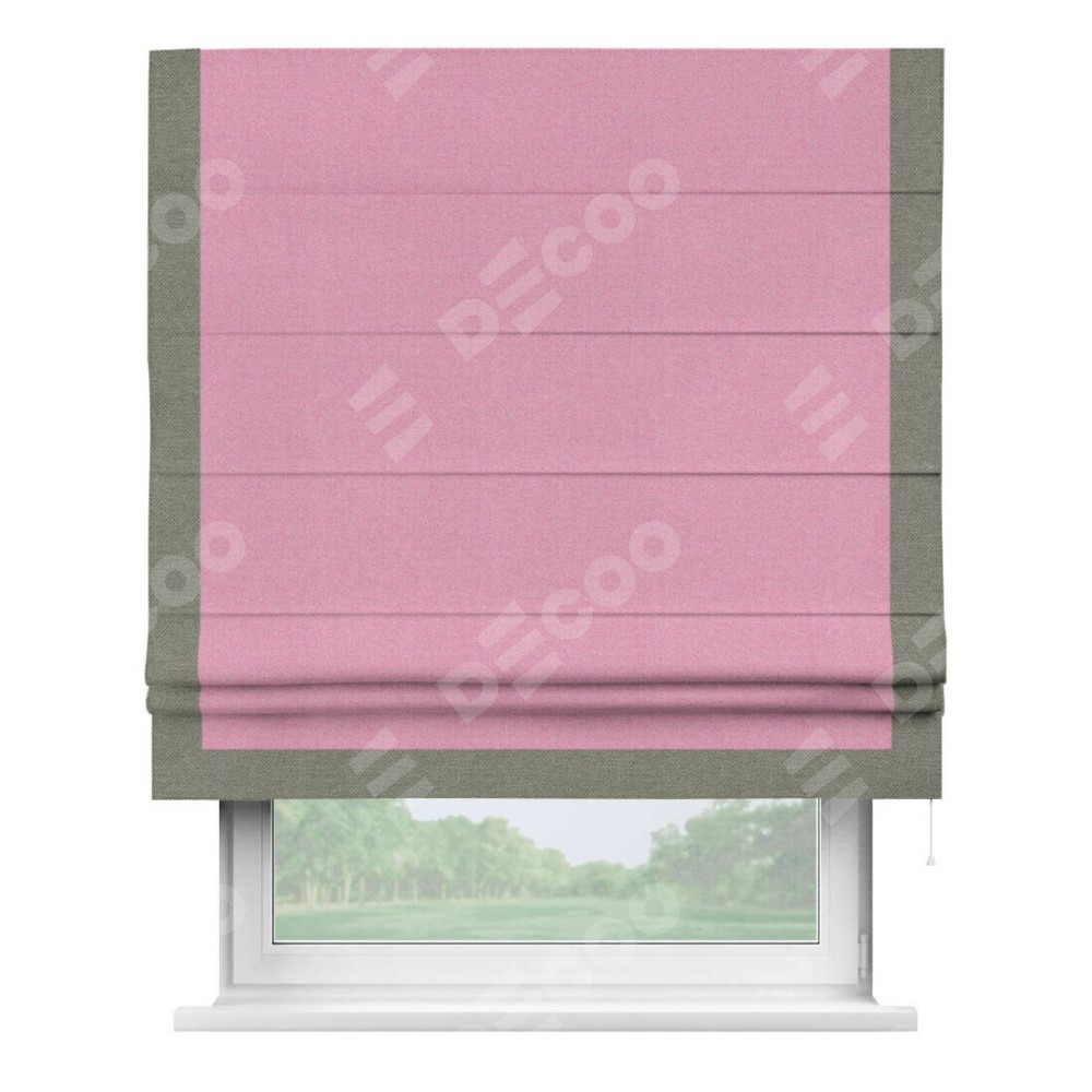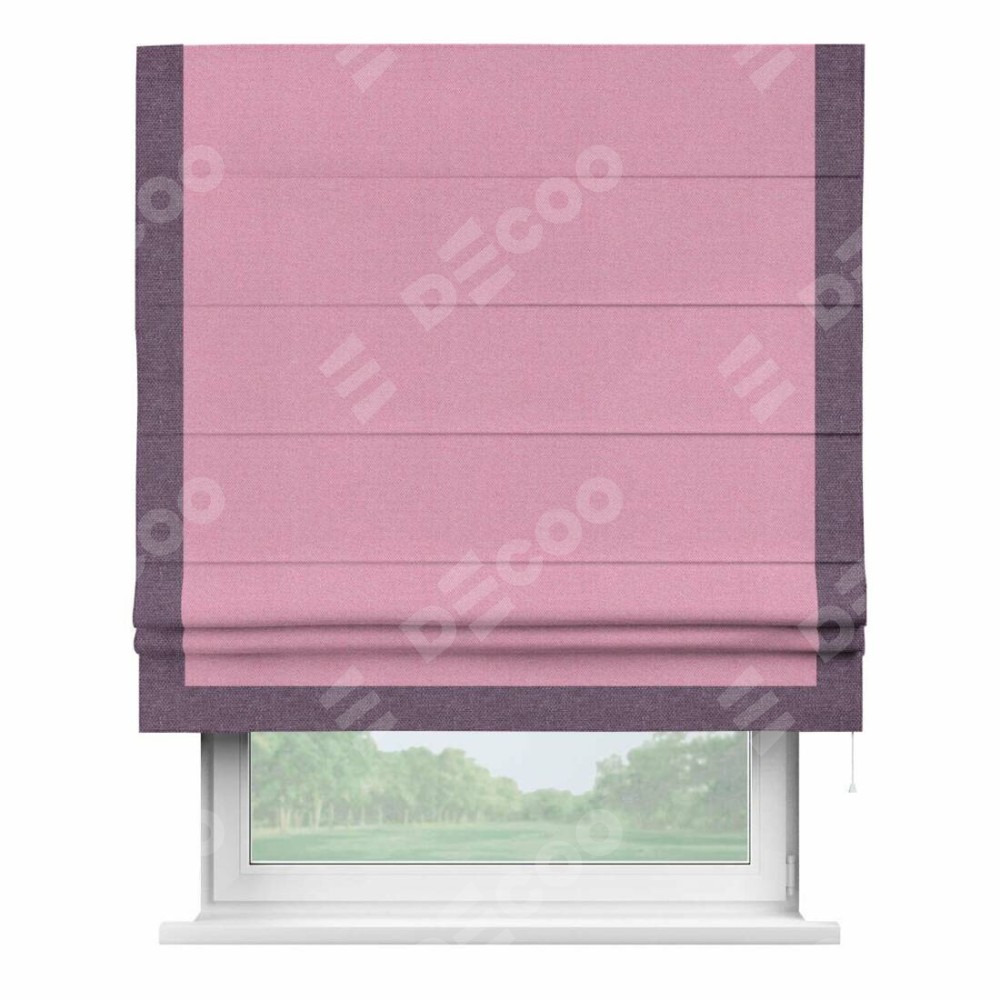 Римская штора производителя «Cortin», используется для проёма, пошита из ткани лён димаут розовый, артикул 16257. Отделка шторы кантом «Виктория», ткань для канта используется из льна димаут разной расцветки на выбор. Имеет универсальный механизм и подходит для монтажа: на потолок, на стену и в нишу.