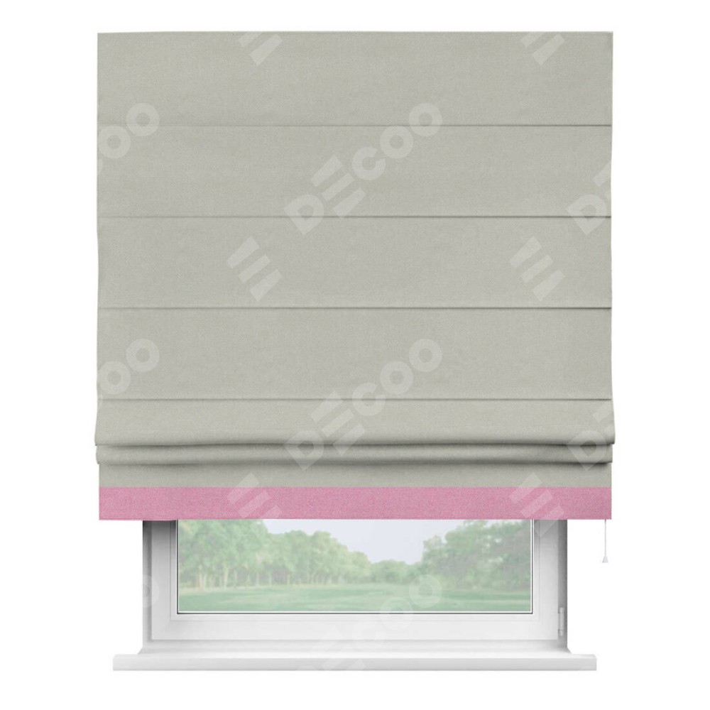 Римская штора производителя «Cortin», используется для проёма, пошита из ткани лён димаут светло-серый, артикул 83025. Отделка шторы кантом «Джестер», ткань для канта используется из льна димаут разной расцветки на выбор. Имеет универсальный механизм и подходит для монтажа: на потолок, на стену и в нишу.