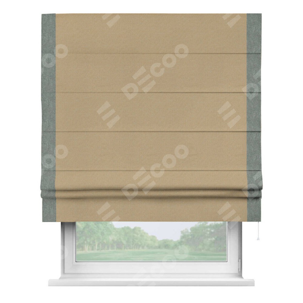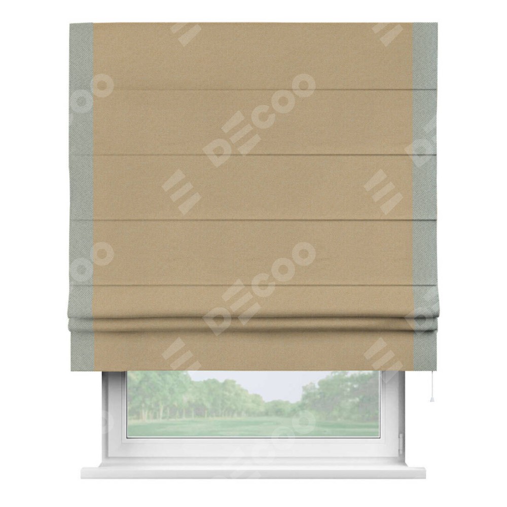 Римская штора производителя «Cortin», используется для проёма, пошита из ткани лён димаут тёмно-бежевый, артикул 83037. Отделка шторы кантом «Стрим Дуо», ткань для канта используется из льна димаут разной расцветки на выбор. Имеет универсальный механизм и подходит для монтажа: на потолок, на стену и в нишу.