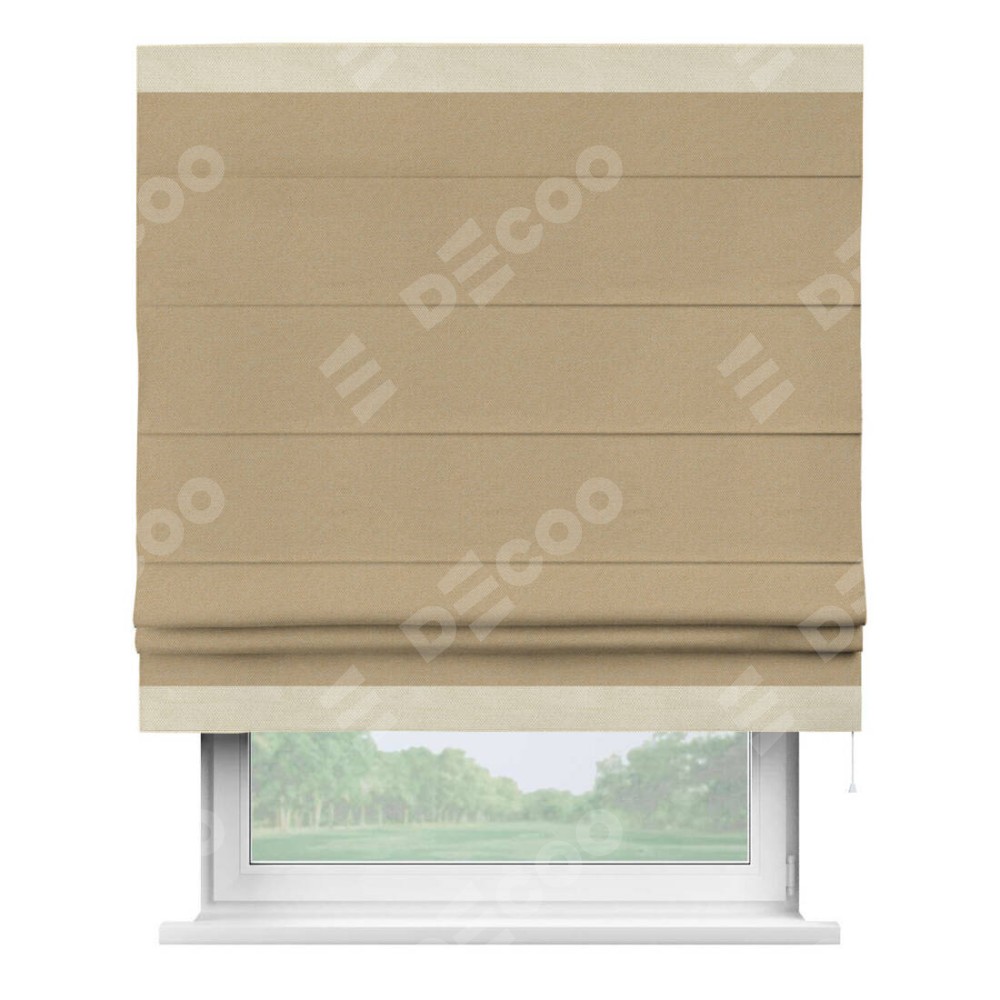 Римская штора производителя «Cortin», используется для проёма, пошита из ткани лён димаут тёмно-бежевый, артикул 83037. Отделка шторы кантом «Горизонт», ткань для канта используется из льна димаут разной расцветки на выбор. Имеет универсальный механизм и подходит для монтажа: на потолок, на стену и в нишу.