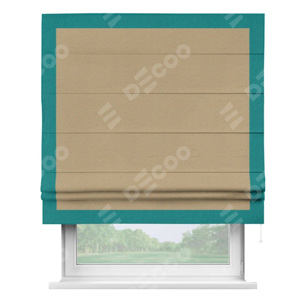 Римская штора производителя «Cortin», используется для проёма, пошита из ткани лён димаут тёмно-бежевый, артикул 83037. Отделка шторы кантом «Чесс», ткань для канта используется из льна димаут разной расцветки на выбор. Имеет универсальный механизм и подходит для монтажа: на потолок, на стену и в нишу.