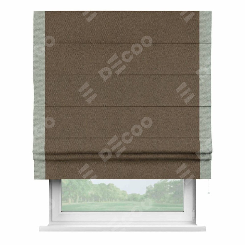 Римская штора производителя «Cortin», используется для проёма, пошита из ткани лён димаут тёмно-коричневый, артикул 83030. Отделка шторы кантом «Стрим Дуо», ткань для канта используется из льна димаут разной расцветки на выбор. Имеет универсальный механизм и подходит для монтажа: на потолок, на стену и в нишу.