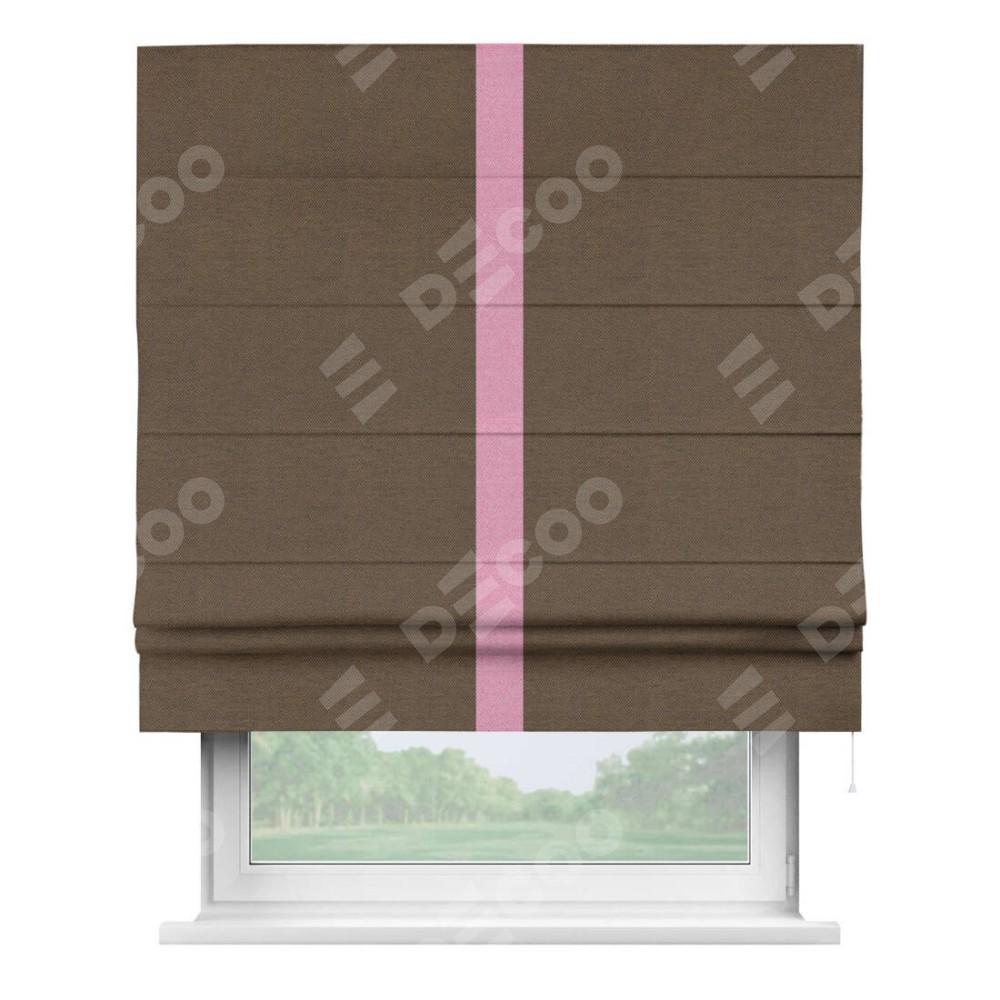 Римская штора производителя «Cortin», используется для проёма, пошита из ткани лён димаут тёмно-коричневый, артикул 83 030. Отделка шторы кантом «Хайвэй», ткань для канта используется из льна димаут разной расцветки на выбор. Имеет универсальный механизм и подходит для монтажа: на потолок, на стену и в нишу.
