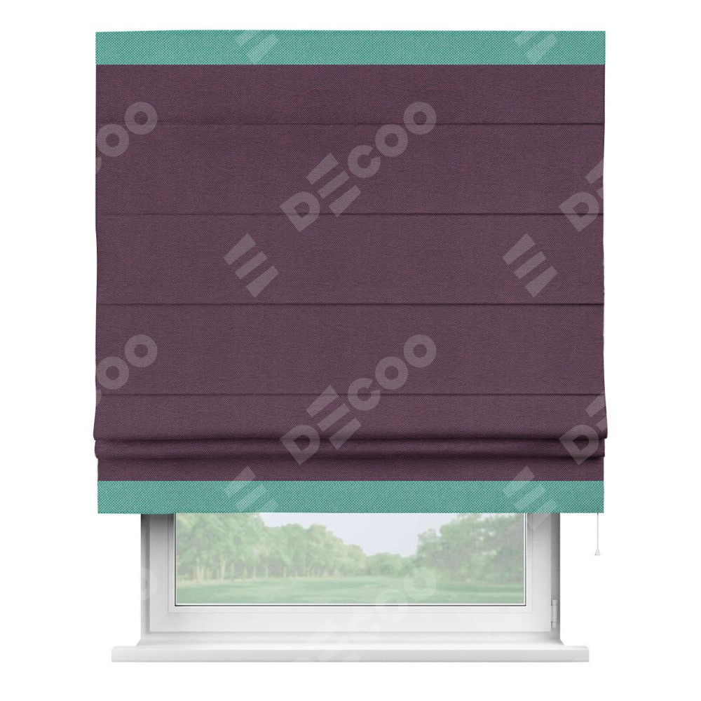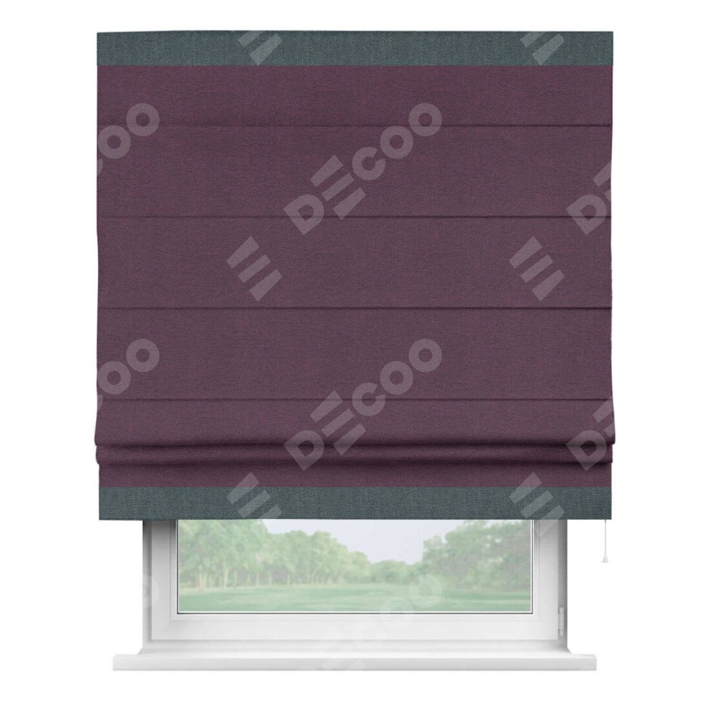 Римская штора производителя «Cortin», используется для проёма, пошита из ткани лён димаут фиолетовый, артикул 8817. Отделка шторы кантом «Горизонт», ткань для канта используется из льна димаут разной расцветки на выбор. Имеет универсальный механизм и подходит для монтажа: на потолок, на стену и в нишу.