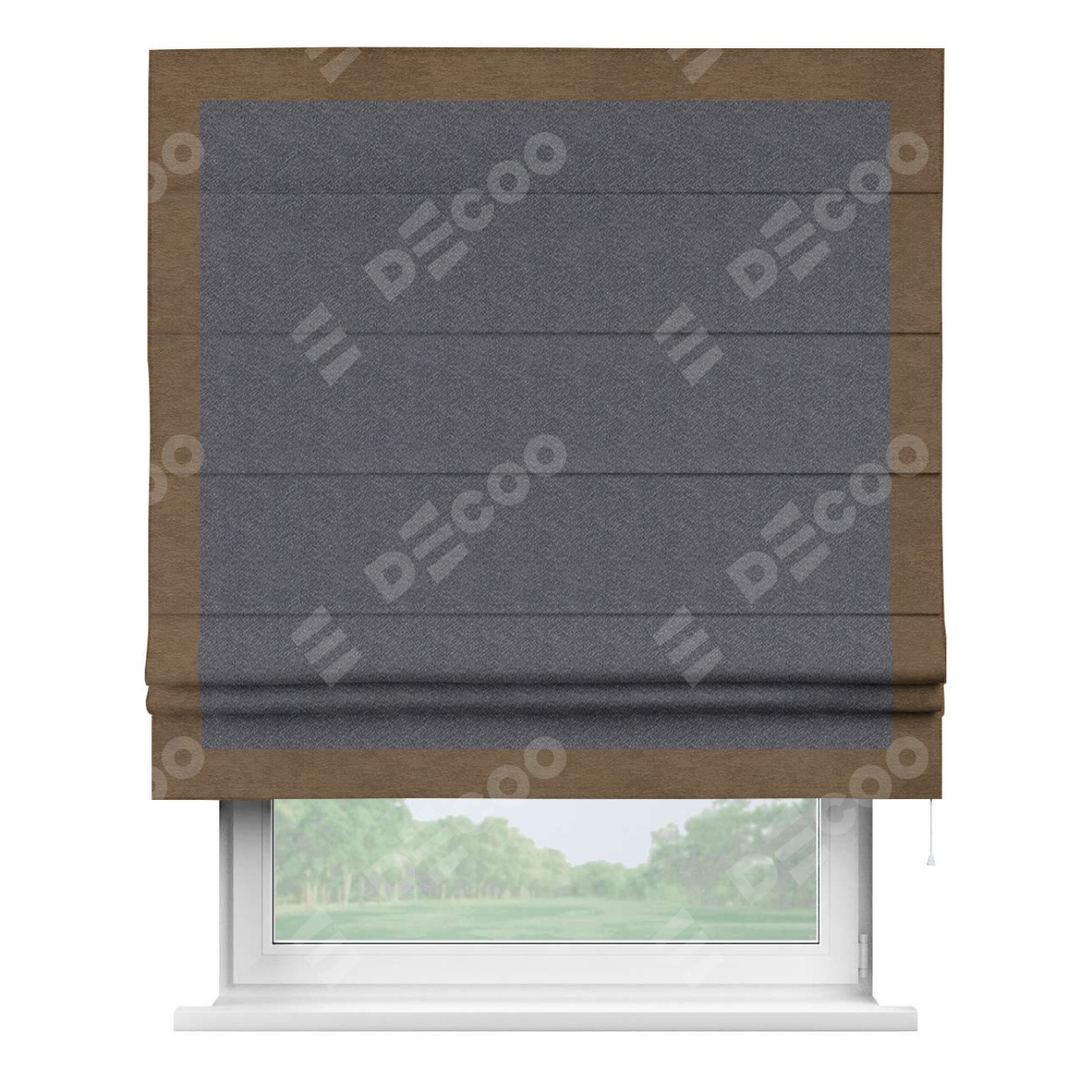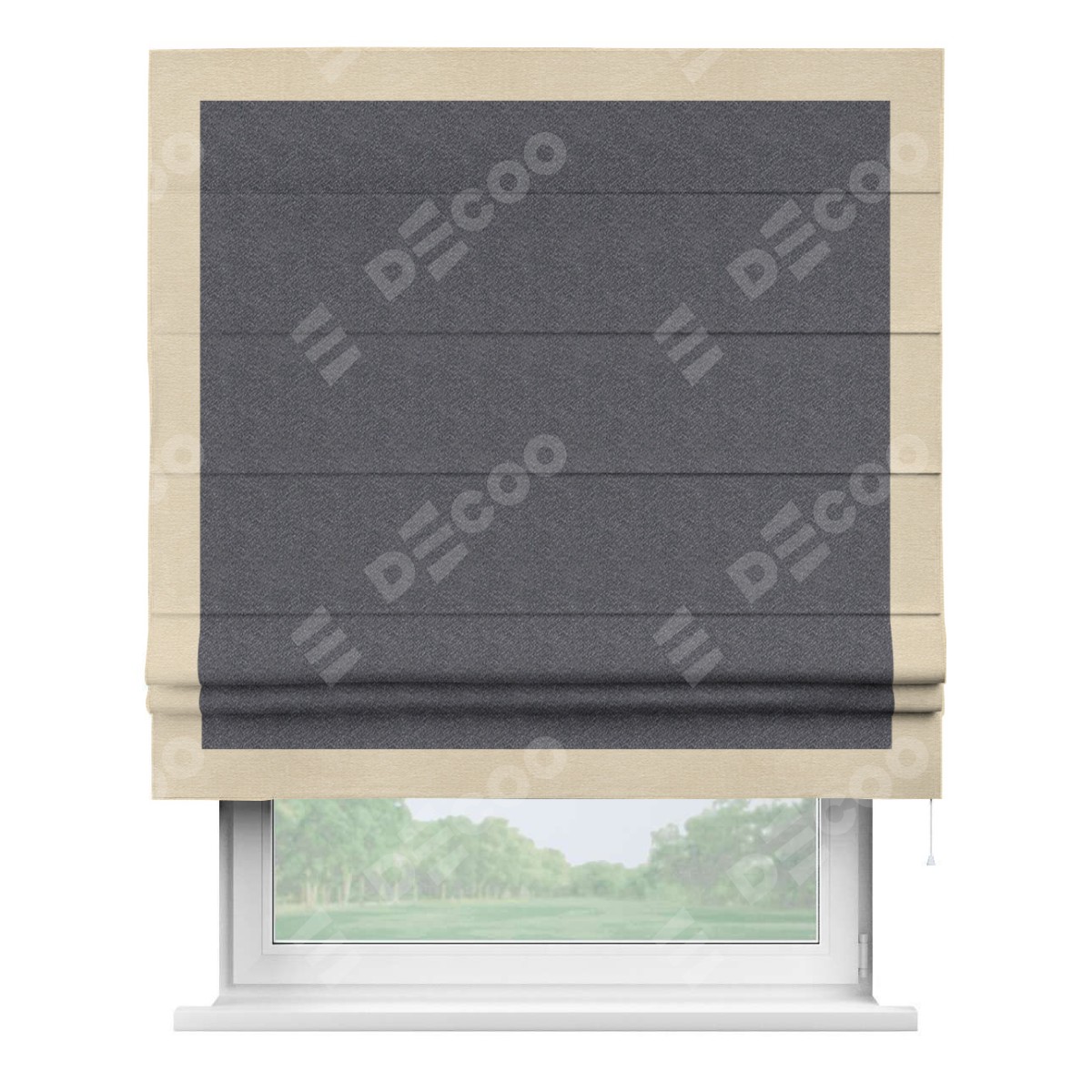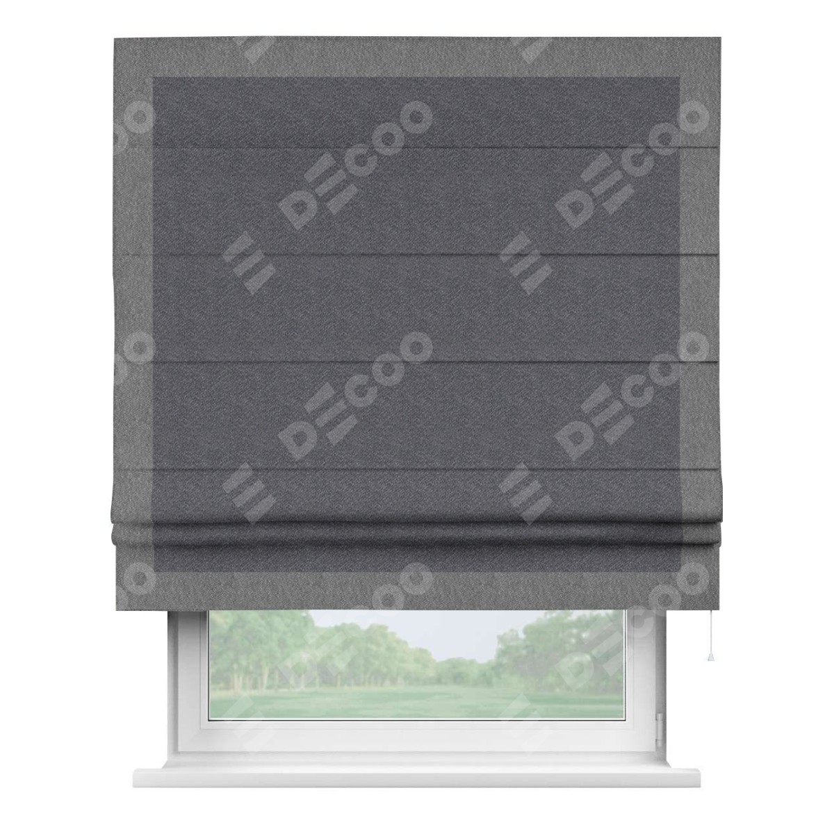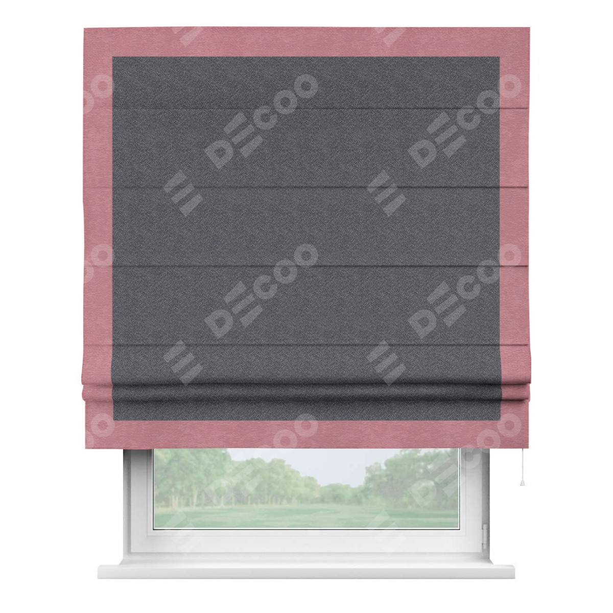 Римская штора производителя «Cortin», используется для проёма, пошита из ткани софт однотонный графит, артикул 19316. Отделка шторы кантом «Чесс», ткань для канта используется из софта разной расцветки на выбор. Имеет универсальный механизм и подходит для монтажа: на потолок, на стену и в нишу.