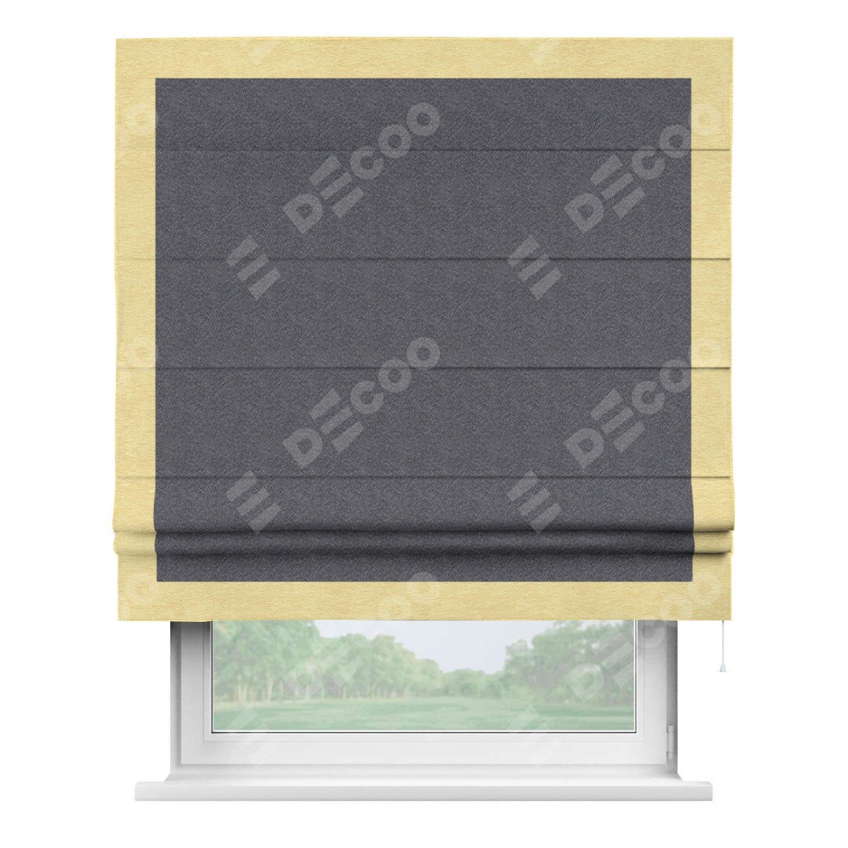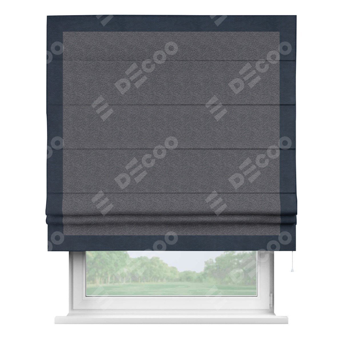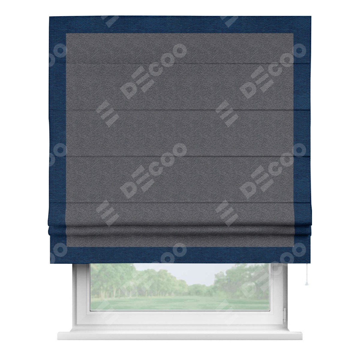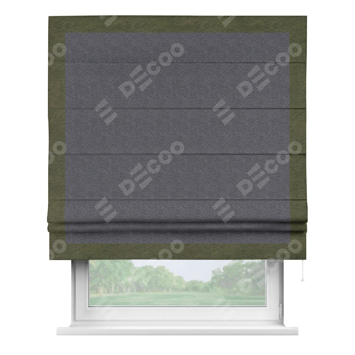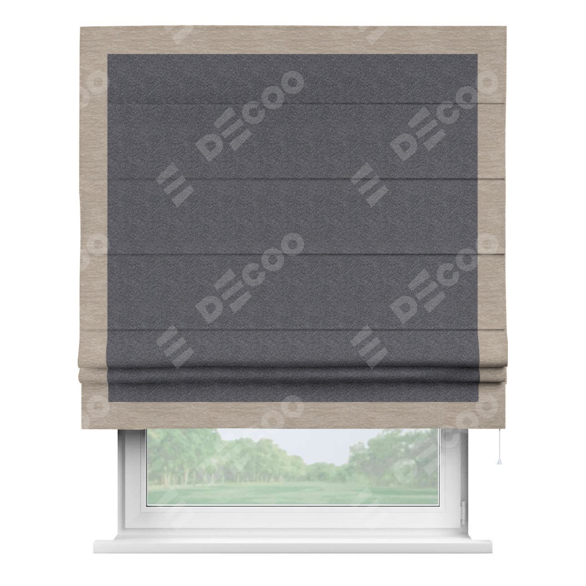 Римская штора производителя «Cortin», используется для проёма, пошита из ткани софт однотонный графит, артикул 19316. Отделка шторы кантом «Чесс», ткань для канта используется из софта разной расцветки на выбор. Имеет универсальный механизм и подходит для монтажа: на потолок, на стену и в нишу.
