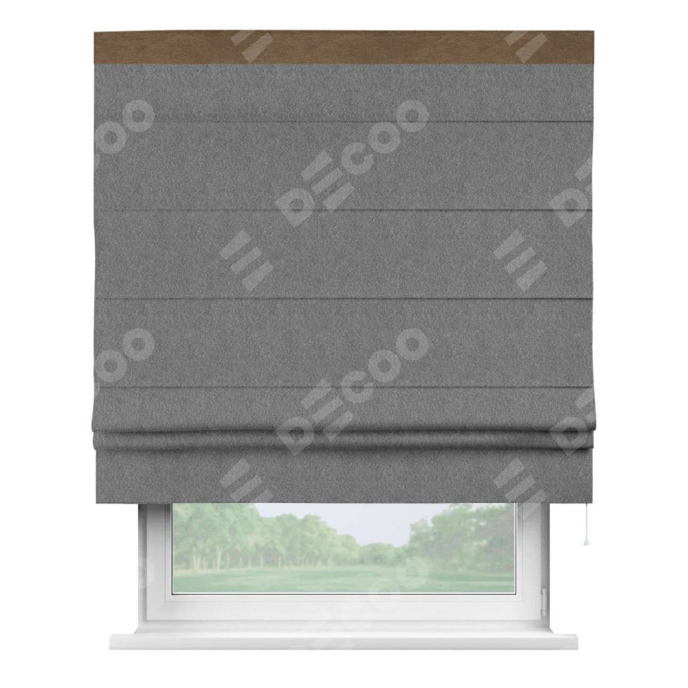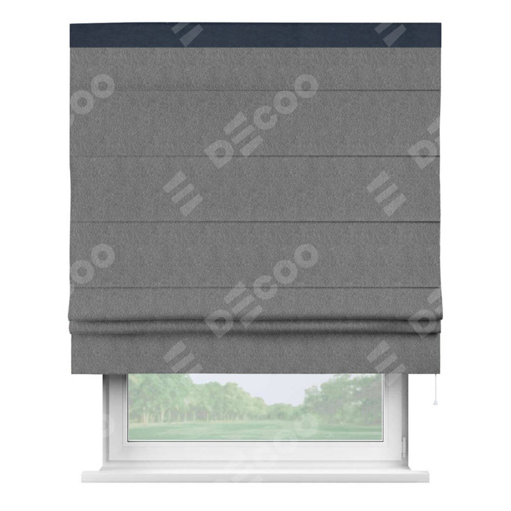 Римская штора производителя «Cortin», используется для проёма, пошита из ткани софт однотонный серый, артикул 70605. Отделка шторы кантом «Кинг», ткань для канта используется из софта разной расцветки на выбор. Имеет универсальный механизм и подходит для монтажа: на потолок, на стену и в нишу.