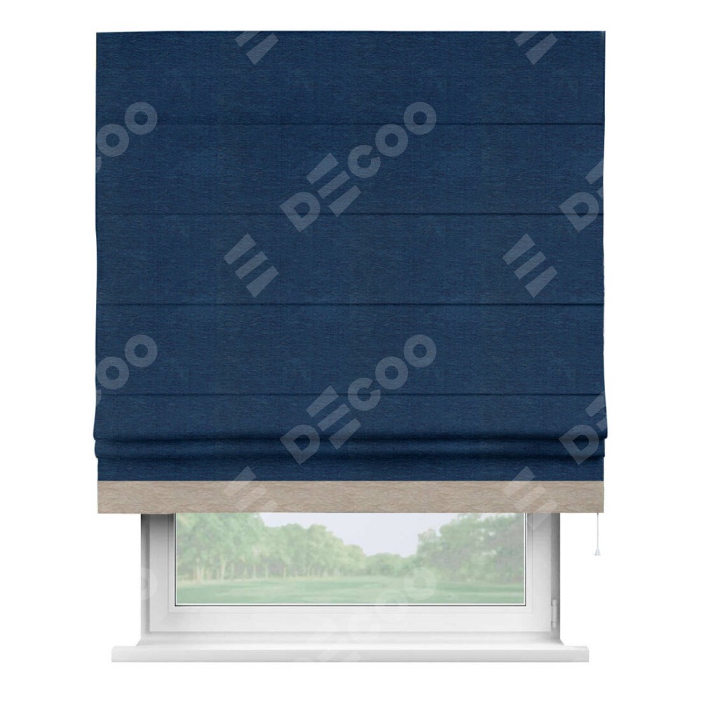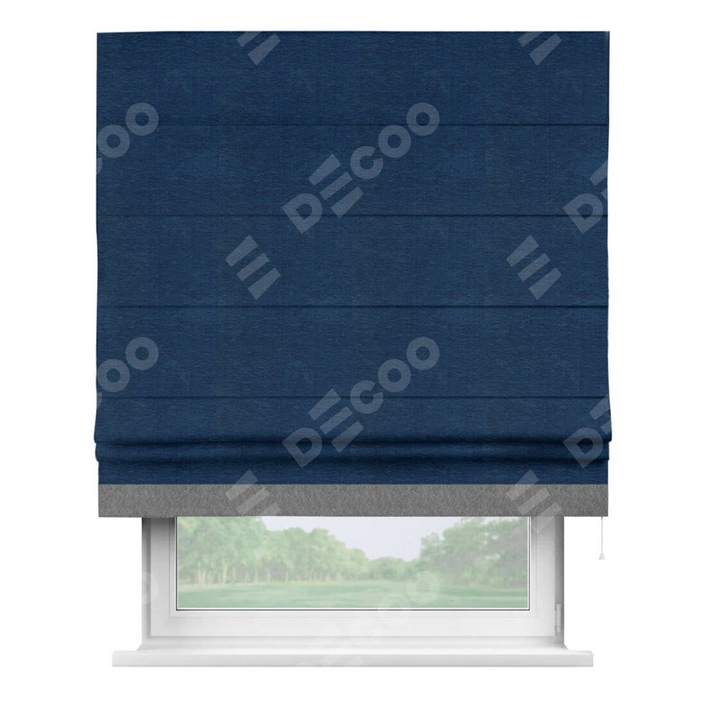 Римская штора производителя «Cortin», используется для проёма, пошита из ткани софт однотонный синий, артикул 42937. Отделка шторы кантом «Джестер», ткань для канта используется из софта разной расцветки на выбор. Имеет универсальный механизм и подходит для монтажа: на потолок, на стену и в нишу.