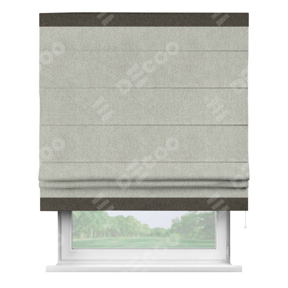 Римская штора производителя «Cortin», используется для проёма, пошита из ткани твид блэкаут коричнево-серый, артикул 21574. Отделка шторы кантом «Горизонт», ткань для канта используется из твида разной расцветки на выбор. Имеет универсальный механизм и подходит для монтажа: на потолок, на стену и в нишу.