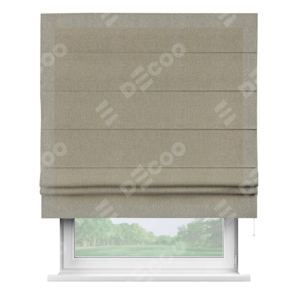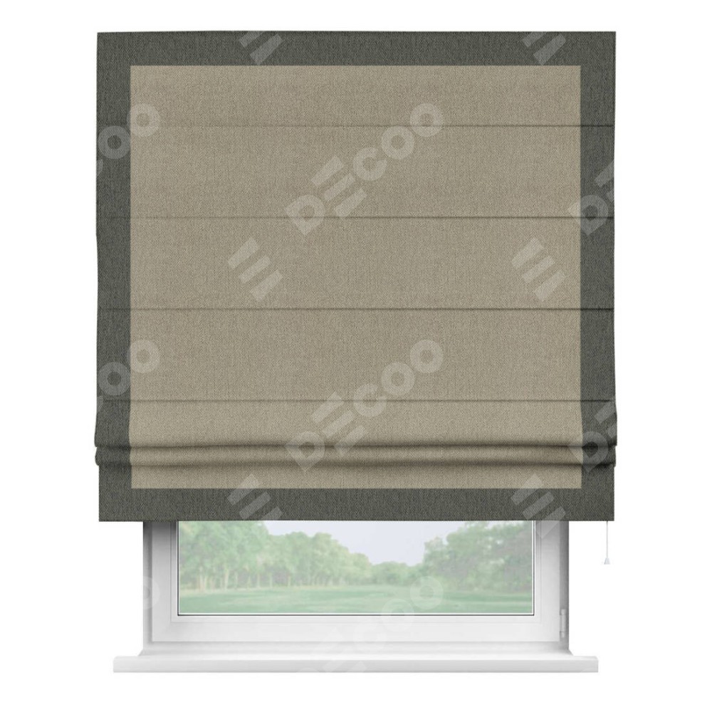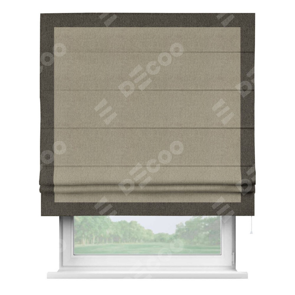 Римская штора производителя «Cortin», используется для проёма, пошита из ткани твид блэкаут кофе, артикул 21575. Отделка шторы кантом «Чесс», ткань для канта используется из твида разной расцветки на выбор. Имеет универсальный механизм и подходит для монтажа: на потолок, на стену и в нишу.