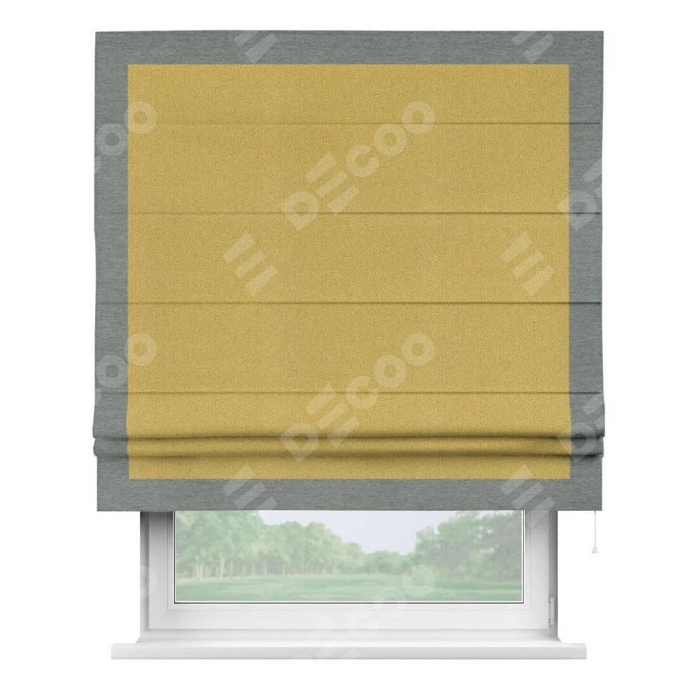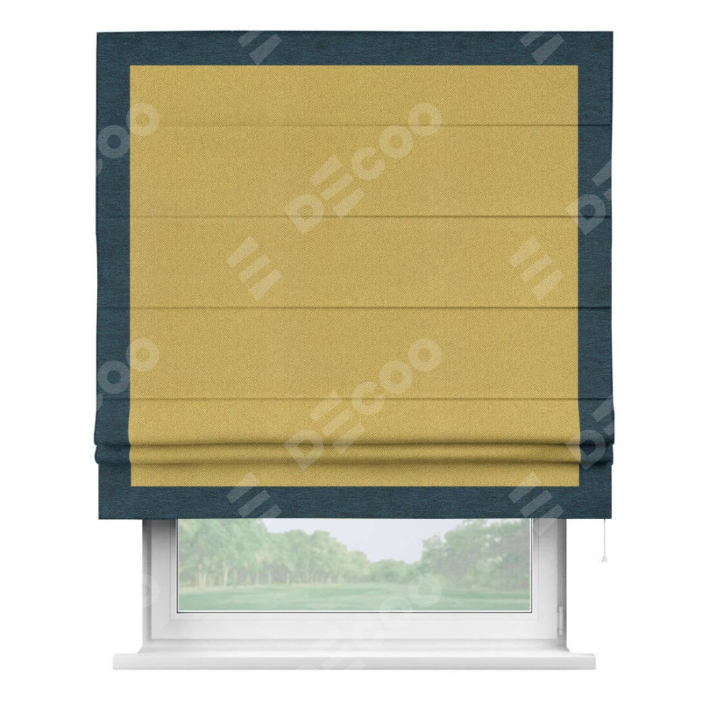 Римская штора производителя «Cortin», используется для проёма, пошита из ткани твид блэкаут пыльная горчица, артикул 21588. Отделка шторы кантом «Чесс», ткань для канта используется из твида разной расцветки на выбор. Имеет универсальный механизм и подходит для монтажа: на потолок, на стену и в нишу.