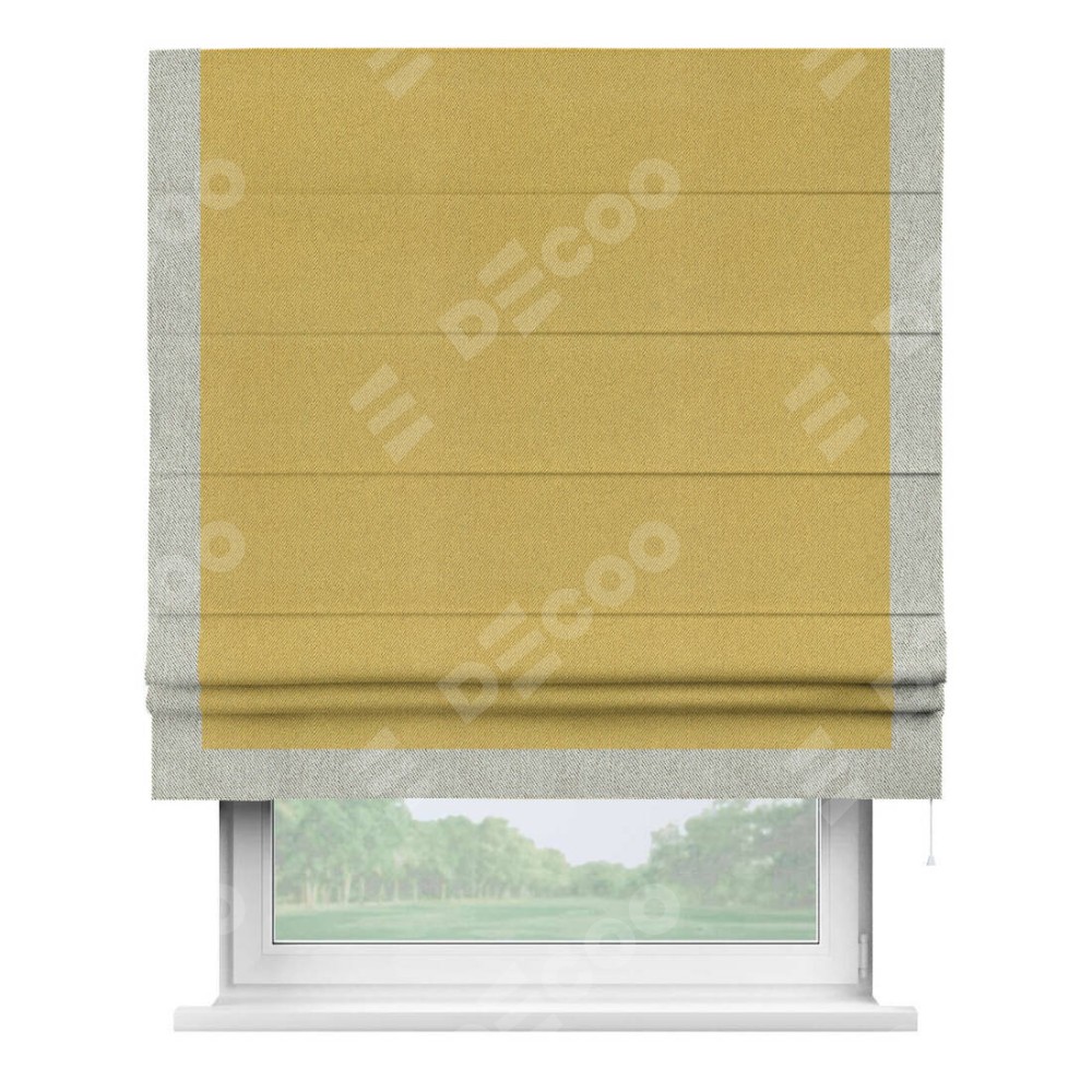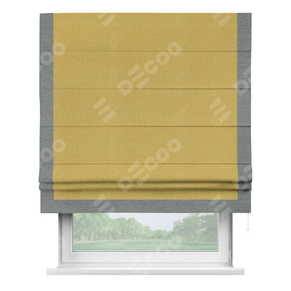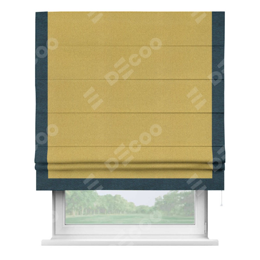 Римская штора производителя «Cortin», используется для проёма, пошита из ткани твид блэкаут пыльная горчица, артикул 21588. Отделка шторы кантом «Виктория», ткань для канта используется из твида разной расцветки на выбор. Имеет универсальный механизм и подходит для монтажа: на потолок, на стену и в нишу.