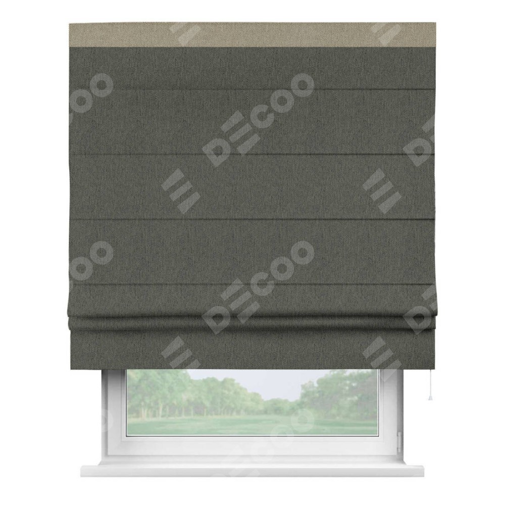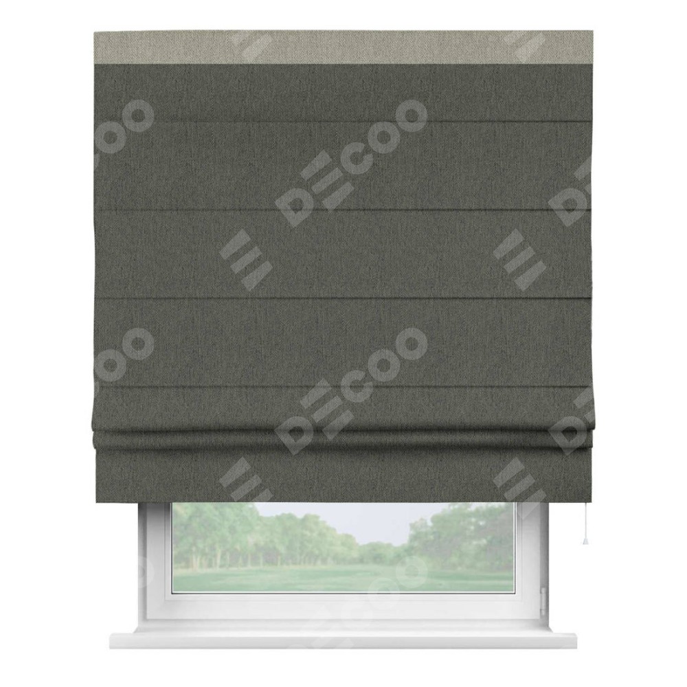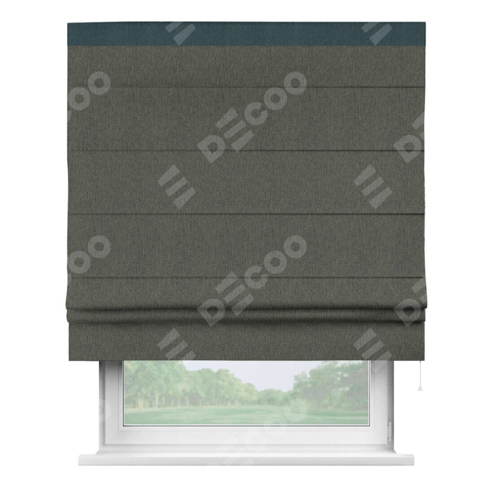 Римская штора производителя «Cortin», используется для проёма, пошита из ткани твид блэкаут тёмно-серый, артикул 21587. Отделка шторы кантом «Кинг», ткань для канта используется из твида разной расцветки на выбор. Имеет универсальный механизм и подходит для монтажа: на потолок, на стену и в нишу.