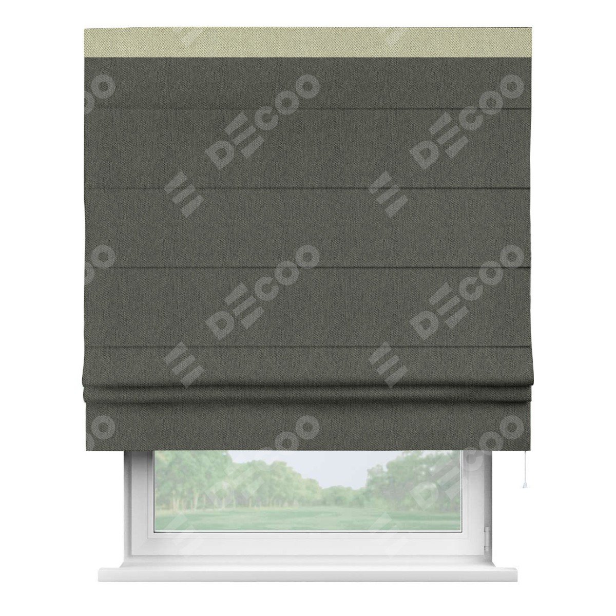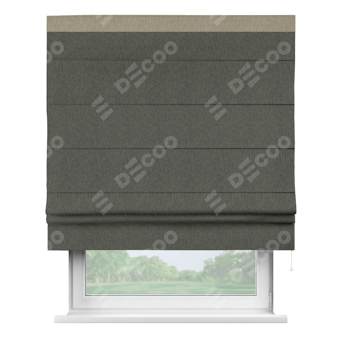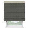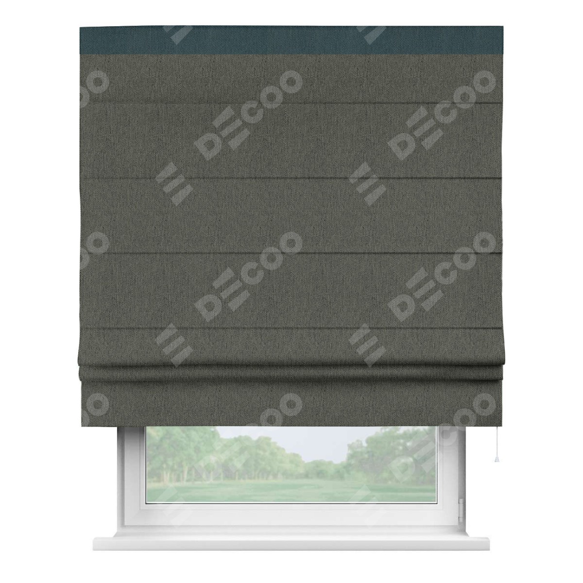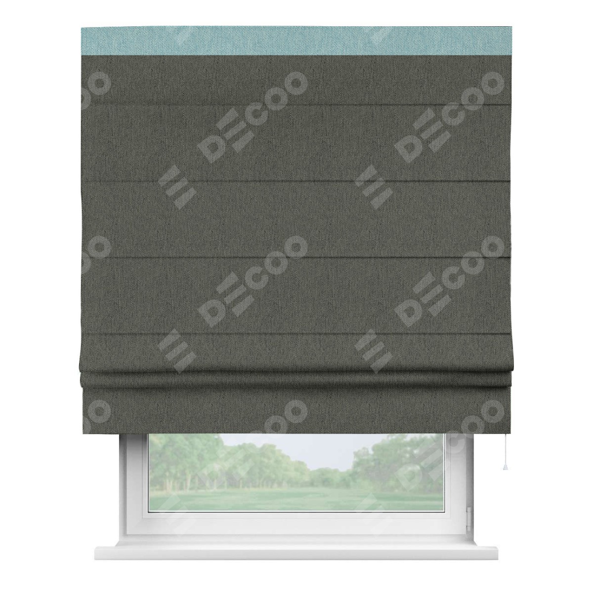Римская штора производителя «Cortin», используется для проёма, пошита из ткани твид блэкаут тёмно-серый, артикул 21587. Отделка шторы кантом «Кинг», ткань для канта используется из твида разной расцветки на выбор. Имеет универсальный механизм и подходит для монтажа: на потолок, на стену и в нишу.