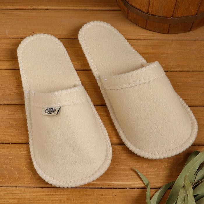 Тапочки из войлока и коврик впитывают влагу и сохраняют сухость, что обеспечивает комфорт во время посещения парной.