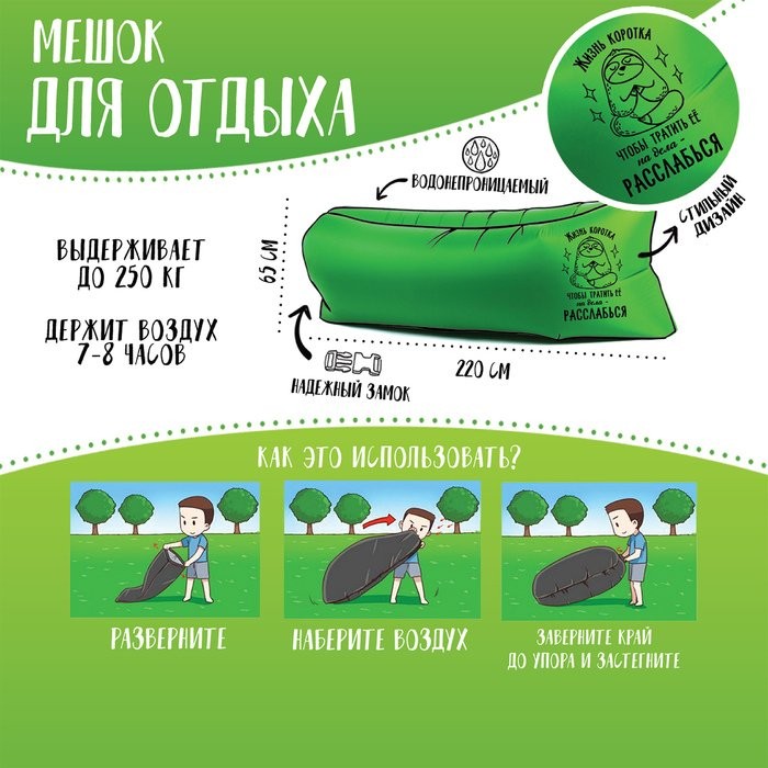Воздух в это надувное приспособление наполняется самостоятельно, и каких-либо навыков и инструментов для установки не требуется. Причем при наличии небольшого ветерка мешок и вовсе не придется трясти — шезлонг надуется сам. В сложенном виде не занимает много места и практически ничего не весит. Зато, когда необходимо, вы всегда надуете его за несколько секунд.