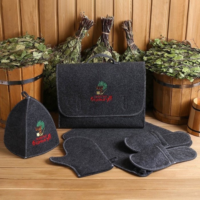 В портфеле можно хранить банные принадлежности и средства личной гигиены. Банная шапка защитит голову от перегрева, волосы от ломкости, а рукавица — от случайных ожогов.
