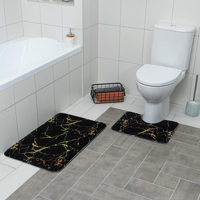 Набор ковриков для ванны и туалета Доляна «Мрамор», 2 шт: 79×50, 50×39 см, цвет чёрный