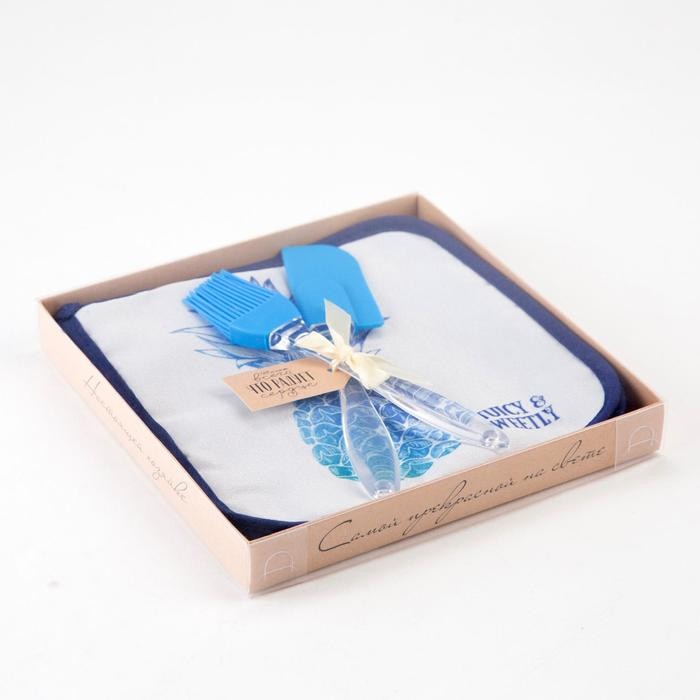 В набор входит 2 прихватки 19 × 19 см, силиконовые лопатка и кисточка.